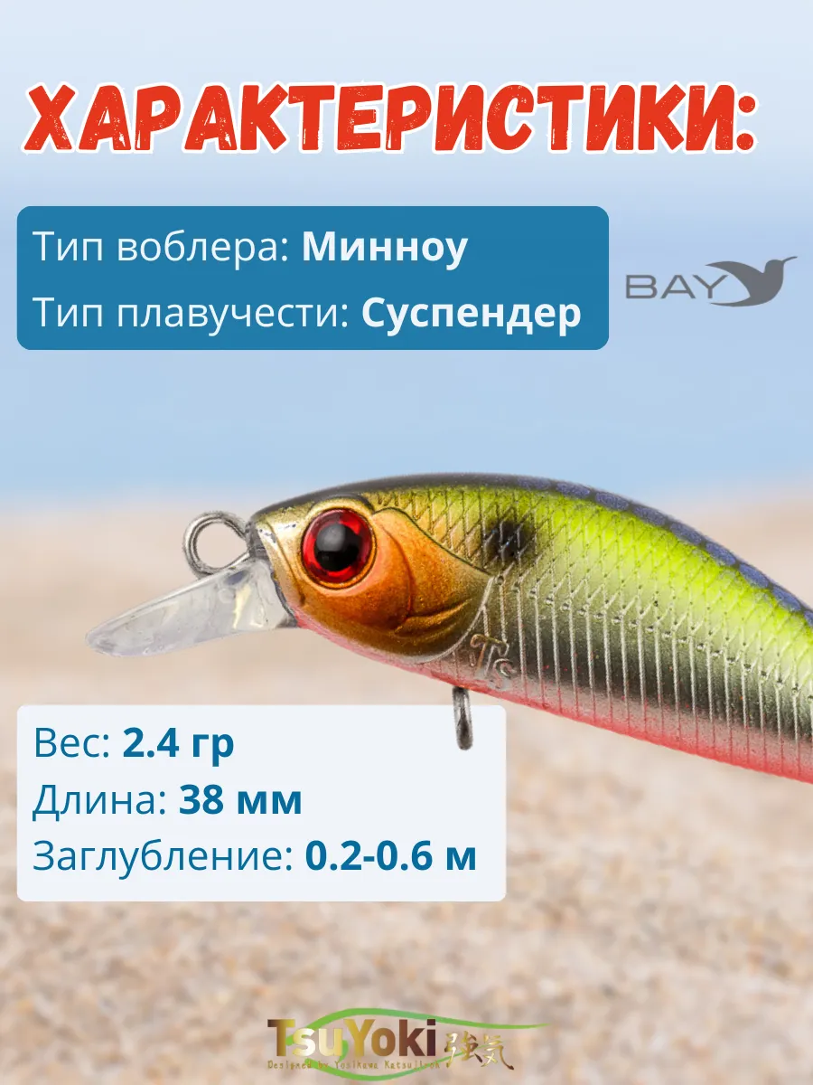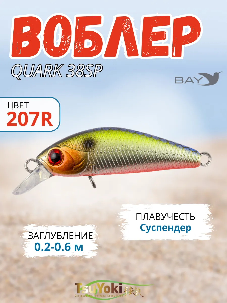 QUARK 38SP имеет узкое вытянутое тело, сужающееся плавными линиями в направлении хвостового тройника. Поверхность боков воблера покрыта косыми насечками-чешуйками. Головная часть воблера рельефно имитирует жаберные крышки рыбки. Вклеенные объемные глаза завершают реалистичный внешний вид приманки. QUARK 38SP оснащен системой дальнего заброса, выполняющей также функцию шумовой камеры. В оснащении воблера использованы два острых тройника из тонкой проволоки, качественная фурнитура и заводные кольца. Анимация QUARK 38SP типична для воблеров данного класса. На равномерной проводке у воблера имеется собственная игра с колебаниями вдоль горизонтальной оси приманки. Рывковая анимация (твичинг), анимация методом «стоп-энд-гоу» так же востребованы при работе с QUARK 38SP. На реках с быстрым течением возможна ловля на снос поперек струи с контролем проводки удилищем и медленным подбором шнура катушкой.
