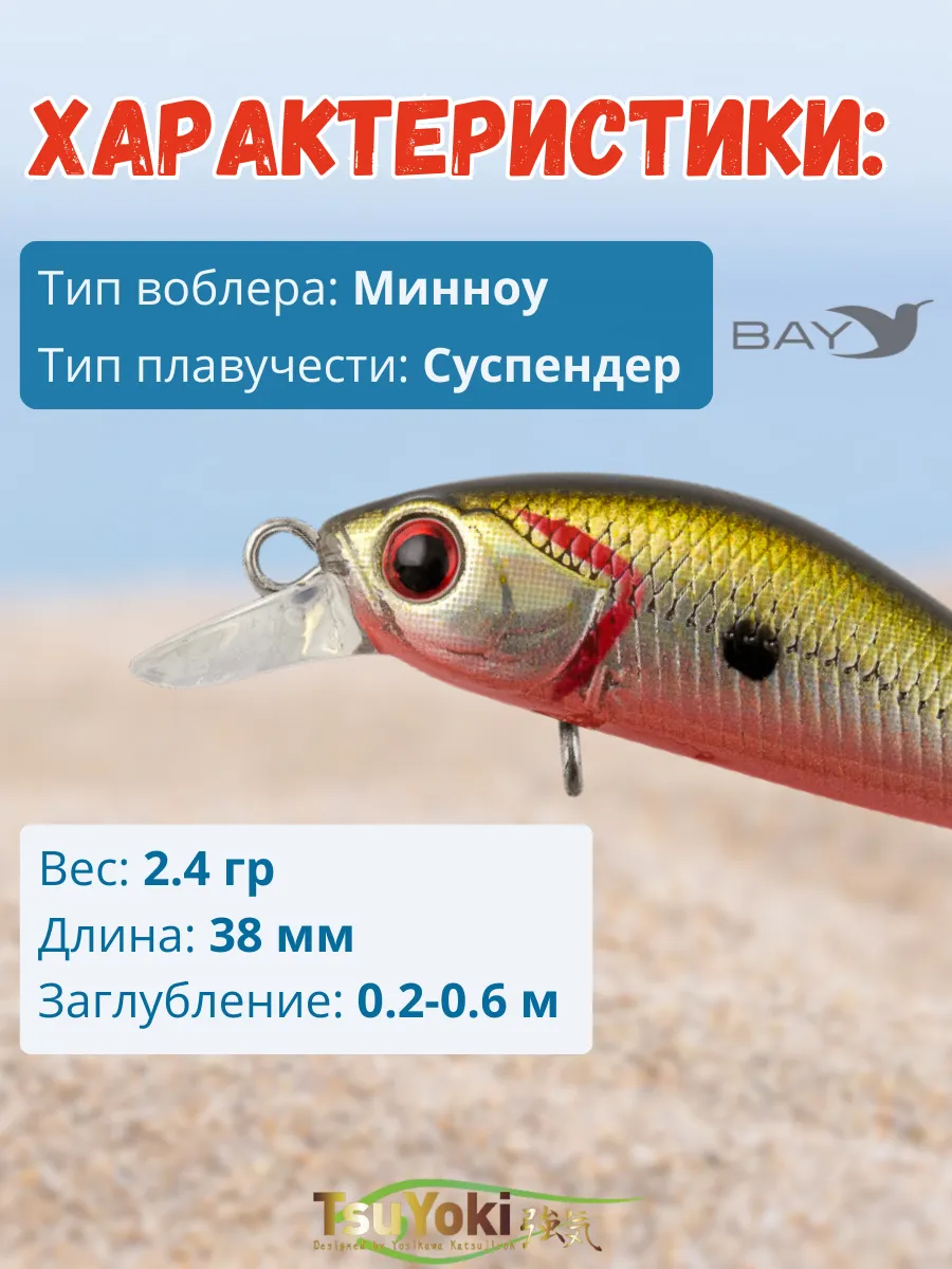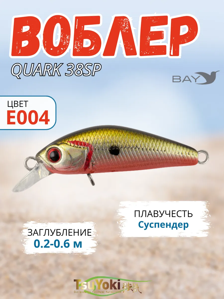 QUARK 38SP имеет узкое вытянутое тело, сужающееся плавными линиями в направлении хвостового тройника. Поверхность боков воблера покрыта косыми насечками-чешуйками. Головная часть воблера рельефно имитирует жаберные крышки рыбки. Вклеенные объемные глаза завершают реалистичный внешний вид приманки. QUARK 38SP оснащен системой дальнего заброса, выполняющей также функцию шумовой камеры. В оснащении воблера использованы два острых тройника из тонкой проволоки, качественная фурнитура и заводные кольца. Анимация QUARK 38SP типична для воблеров данного класса. На равномерной проводке у воблера имеется собственная игра с колебаниями вдоль горизонтальной оси приманки. Рывковая анимация (твичинг), анимация методом «стоп-энд-гоу» так же востребованы при работе с QUARK 38SP. На реках с быстрым течением возможна ловля на снос поперек струи с контролем проводки удилищем и медленным подбором шнура катушкой.