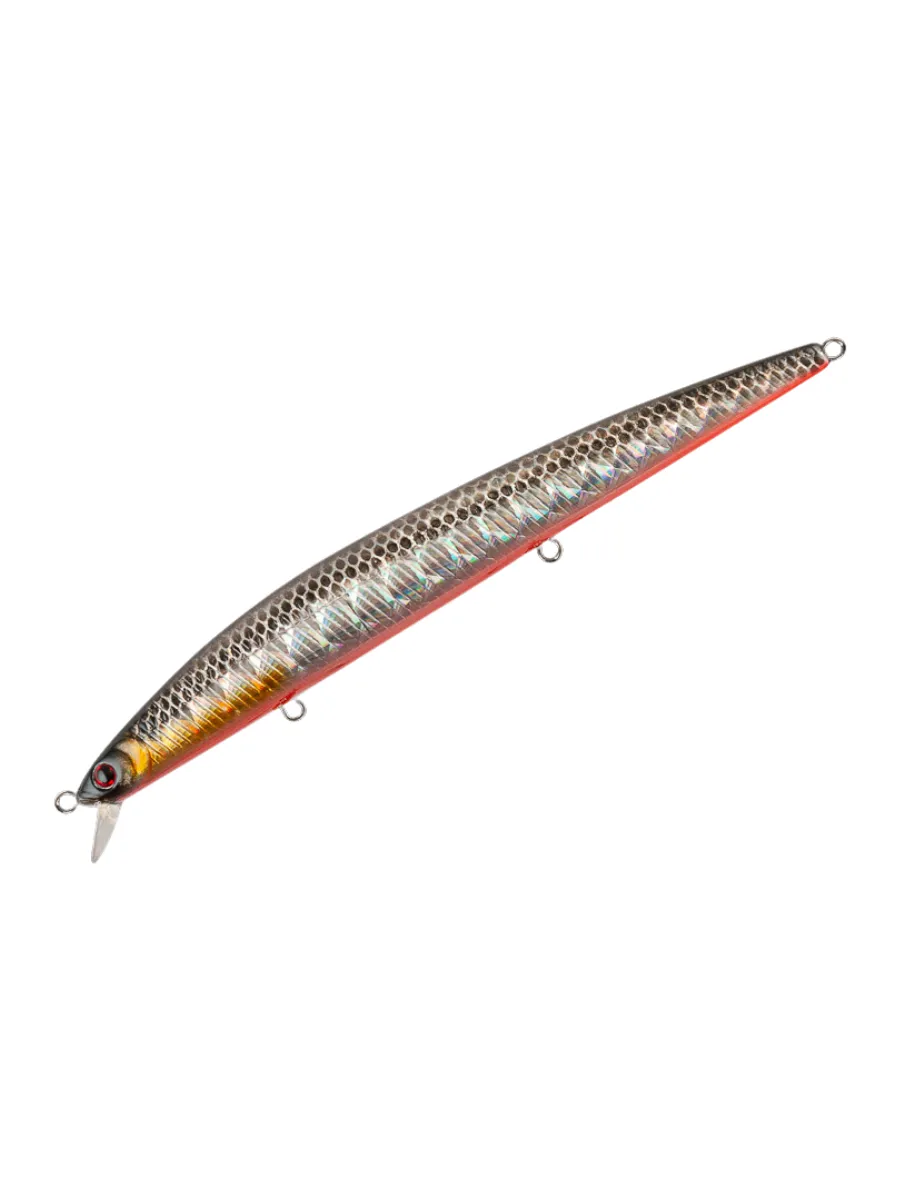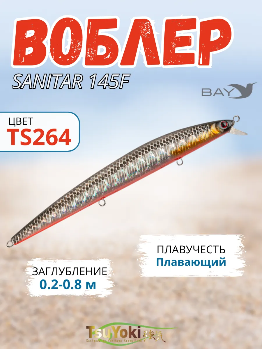 SANITAR 145F имеет две, разделенные боковой линией, рельефные фактуры поверхности. Верхняя часть выполнена в виде чешуек, нижняя в виде косых насечек. Головная часть воблера рельефно имитирует жаберные крышки рыбки. Небольшие 3D-глаза дополняют реалистичность дизайна всей приманки. Встроенная система дальнего заброса одновременно является и системой баланса приманки. Воблер бесшумный, при проводке привлекает рыбу только своей игрой, не создавая шумового сопровождения. SANITAR 145F оснащен тремя острыми тройниками и силовыми заводными кольцами. Качественное лакокрасочное покрытие соответствует лучшим образцам современного воблеростроения. Приманка летит далеко и точно, чему способствует встроенная система дальнего заброса. Дальний заброс и стабильное поведение приманки в полете позволяют использовать SANITAR 145F как воблер-поисковик, способный за короткий период облавливать большие площади акватории, а также в качестве приманки для точечного облова локальных «окон» среди коряг или водной растительности. На равномерной проводке SANITAR 145F имеет выраженную собственную игру, активно раскачиваясь из стороны в сторону и виляя хвостовой частью. При рывковой анимации воблер охотно отзывается на любую манипуляцию удилищем. На акцентированных коротких рывках воблер уходит в сторону от оси проводки, разворачивается и зависает с остаточными колебаниями в начальной фазе паузы. На более мягких рывках послушно исполняет глайды с роллингом и бликами.
