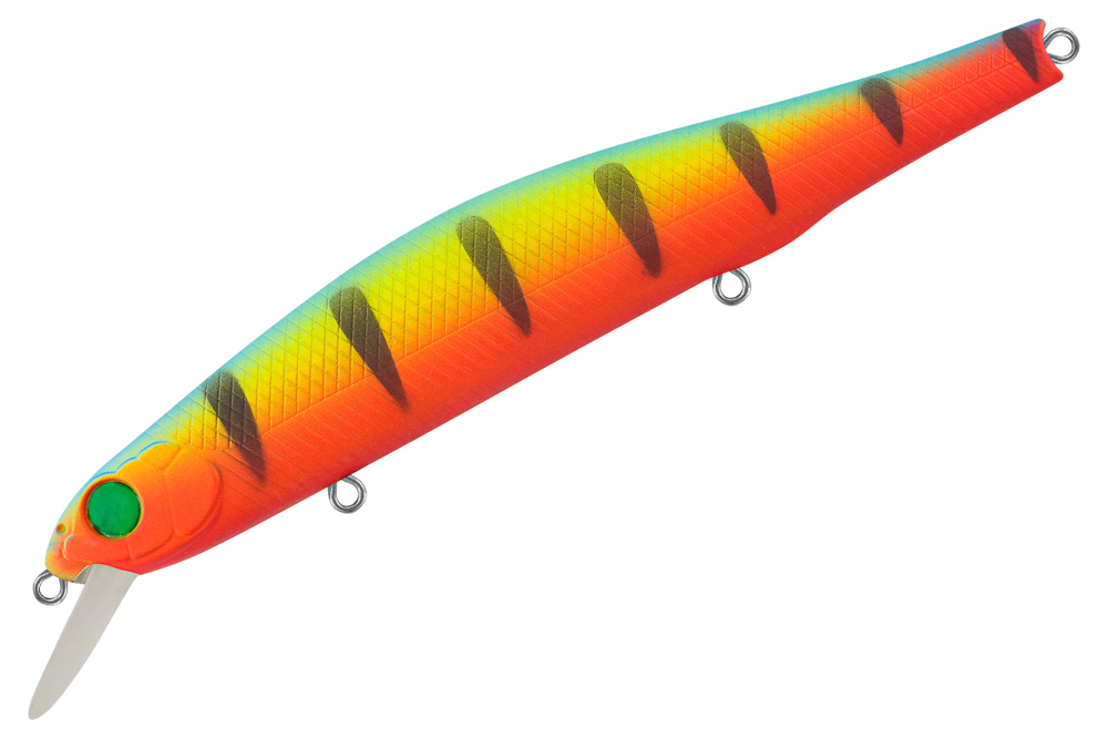 Воблер TsuYoki WATSON 110SP Минноу для облова больших водных территорий с фоновыми глубинами до 3.0 метров. Особенности дизайна: WATSON 110SP имеет две, разделенные боковой линией, рельефные фактуры поверхности. Верхняя часть выполнена в виде ромбовидных насечек , нижняя- в виде косых насечек. Головная часть воблера рельефно имитирует жаберные крышки рыбки, а 3D глаза дополняют реалистичность дизайна всей приманки. WATSON 110SP оснащен магнитной системой дальнего заброса и системой балансировки. Вооружение приманки - три тройника Owner Cultiva соответствующего размера. Качественное ЛКП, соответствующее современным стандартам. Заброс и анимация : WATSON 110SP мы относим к рекордсменам по дальности заброса.В отдельных попытках были зафиксированы результаты превышающие 53 метра. В среднем же WATSON 110SP стабильно показывает длину заброса +45 метров. Столь выдающиеся параметры полета стали возможны благодаря сбалансированной магнитной системе дальнего заброса, маленькой лопате и отличной геометрии приманки. . Тесты на дальность проводились с комплектом: Удилище длиной 7,8 фута быстрого строя , тест 12- 32 гр, катушка 3000С по линейке Шимано, шнур #0,6. Для WATSON 110SP применимы все варианты проводок, от равномерной до рывковой. На равномерной проводке воблер имеет выраженную собственную игру,активно раскачиваясь с боку на бок и виляя хвостовой частью. При проводке стоп-энд-гоу WATSON 110SP на активной фазе роллингует, и устойчиво зависает в паузе, качнув пару раз боками. На рывковой анимации воблер показал себя очень послушным и чутким к каждой манипуляции удилищем. Анимация возможна как мягкими (почти как протяжка) рывками, так и низкоамплитудными резкими рывочками. При них воблер крутится почти на месте, разворачиваясь на 90+ градусов, и эффектно зависает в паузе. Применение легкого поводка # 2 длиной 15 см не оказывает влияния на анимацию. Комплект снастей: Благодаря небольшой лопате WATSON 110SP можно анимировать практически любым удилищем подходящего теста, но наиболее яркую игру наш воблер показывает с удилищем длиной 7,0- 7,8 фута быстрого строя , с тестом до 21 гр, катушка 2000-3000, шнур #0,6-0,8. Миноу Суспендер (SP) 110 мм 17,5 гр Заглубление 0,8-1,2 м