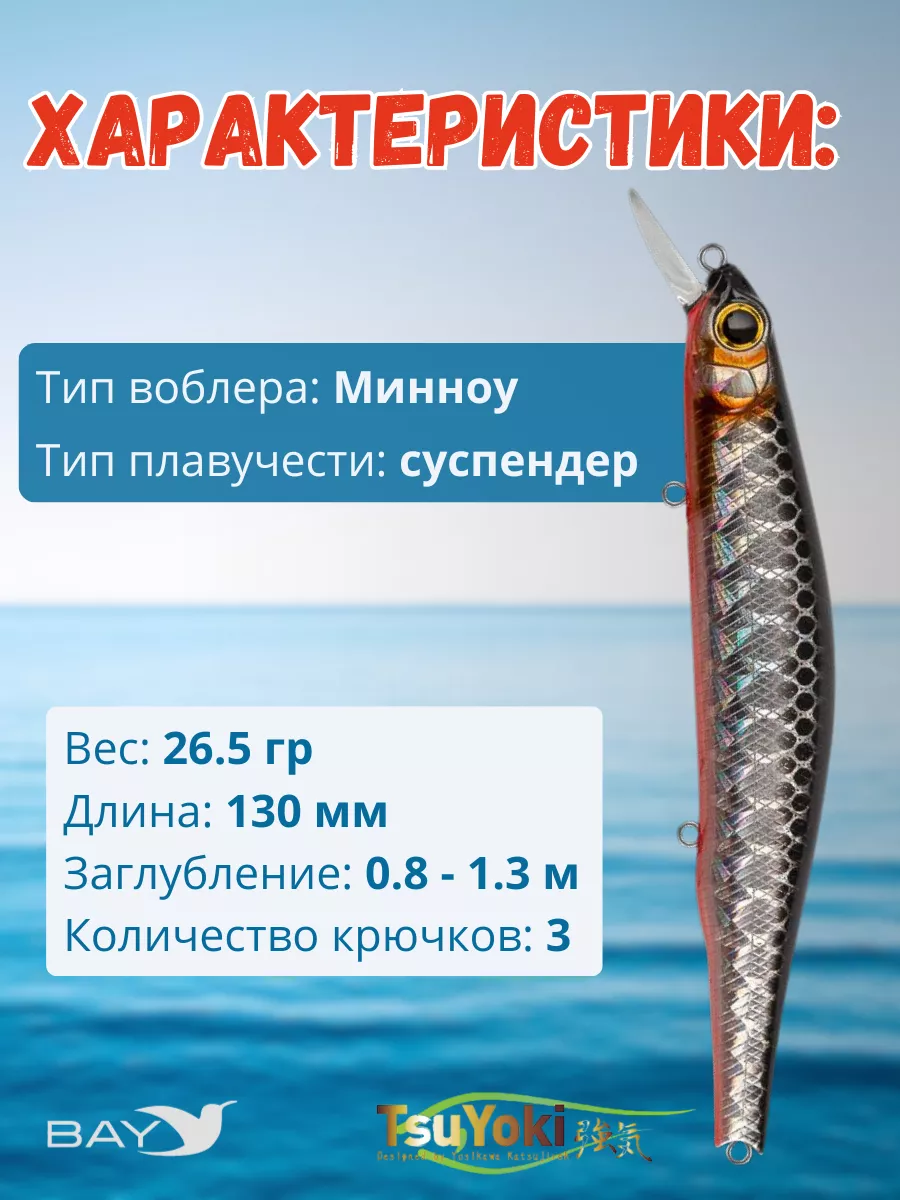 Технические параметры: Суспендер (SP), длина 130 мм, вес 26.5 г, заглубление 0.8 - 1.3 м. Описание: WATSON 130 SP — крупный минноу для облова водных территорий с глубинами до 4-5 м. Его дизайн включает две рельефные текстуры: ромбовидные насечки сверху и косые снизу, имитирующие чешую рыбы. Головная часть воспроизводит жаберные крышки, а большие 3D глаза завершают реалистичный вид. Воблер оснащен магнитной системой дальнего заброса (МСДЗ), балансировочной системой и шумовой камерой с громкими шарами. Три тройника Owner Cultiva, силовая фурнитура и качественное ЛКП соответствуют современным стандартам. Заброс и анимация: Благодаря геометрии и МСДЗ, воблер достигал дальности 40+ метров при тестах. Тесты проводились с удилищем длиной 7.8 фута (быстрый строй, тест 12-38 г), катушкой 3000 по линейке Shimano и шнуром #1.2. Это делает WATSON 130 SP эффективным поисковым воблером, быстро облавливающим большие площади и находящим активного хищника. Для WATSON 130 SP подходят все типы анимации. На равномерной проводке воблер активно раскачивается, виляя хвостом и отклоняясь от оси. На стоп-энд-гоу роллингует и зависает в паузе. Рывковая анимация показывает его чувствительность и послушность: на сильных ударах воблер сильно отклоняется от оси, на мягких рывках делает глайды с роллингом и бликами, а на коротких разворачивается на 90+ градусов и зависает. Целевые трофеи: Основной трофей для WATSON 130 SP — щука, включая трофейные экземпляры. Ночная рыбалка на перекатах может принести судака, используя равномерную, медленную проводку с мягкими рывочками.