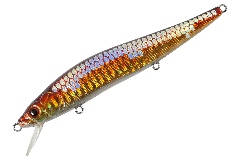 Воблер TsuYoki WINK 110SP Среднеразмерный минноу для ловли на кормовых поливах, вдоль стенок водной растительности и над мелководными коряжниками с глубинами до 2,5-3,5 метров. Особенности дизайна: WINK 110SP имеет две, разделенные боковой линией, рельефные фактуры поверхности. Верхняя часть выполнена в виде ромбовидных насечек - чешуек, нижняя (вплоть до брюшка) в виде косых насечек. Головная часть воблера рельефно имитирует жаберные крышки рыбки, а вклеенные 3D глаза завершают дизайн приманки. Воблер имеет систему дальнего заброса и баланса, и оснащен тремя тройниками Cultiva Owner, а так же силовыми заводными кольцами. В каталоге широкий выбор цветов, от провоцирующих до натуральных. Качество ЛКП на высоком современном уровне. Заброс и анимация : Заброс WINK 110SP достаточно дальний. Воблер улетает на 35+ метров, чего вполне достаточно, учитывая его основное предназначение. С WINK 110SP применимы все варианты анимации, присущие воблерам этого класса. На равномерной проводке он имеет приятную собственную игру, переваливаясь с боку на бок вдоль своей продольной оси. Вариации на тему стоп энд гоу и протяжки различной степени интенсивности и протяженности – отличные приемы для ловли с WINK 110SP. На рывковой проводке воблер не проявляет заметной упористости, все приемы с ним выполняются легко и без перенапряжения. При рывках WINK 110SP рыскает в обе стороны с разворотами до 90 градусов, бликует боками и активно колеблется вдоль продольной оси. В паузе зависает с небольшим дифферентом на нос. Во всех вариантах анимации WINK 110SP прекрасно контролируем и отлично держит заданный горизонт проводки. С поводком 20 см из струны №2 WINK 110SP – чистый суспендер. Наличие поводка не влияет на игру воблера. Поводок обязателен, так как щука является основным целевым трофеем этого воблера. Комплект снастей: Удилище длиной 7,0-8,0 фута быстрого строя , тест до 30-35 гр, катушка 3000 по линейке Шимано, шнур #1,2. Вести с водоёмов: Побросать оба воблера получилось только один раз, поэтому, об уловистости говорить рано. Тем не менее, никаких претензий по собственной игре и отзывчивости на рывок не возникло. WATSON 110SP делался очень долго и в продажу поступил совсем недавно, а WINK 110SP уже успел заработать добрую репутацию на Москве-реке, где хорошо показал себя по ночному судаку. Выявился и характерный недостаток: при ударе о камни нередко отламывается лопатка. Но камни – это, конечно, очень жестко. Миноу Суспендер (SP) 110 мм 15 гр Заглубление 1,2-1,8 м