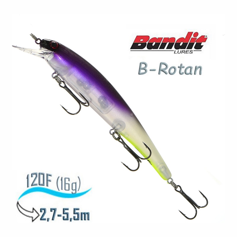 Воблер Bandit B-Rotan, новинка, гибрид уловистых и популярных воблеров Bandit Deep Walleye и Shallow Walleye. Внешне B-Rotan отличается от классической модели Walleye Shallow тем, что оснащен лопаткой другой формы, врезанную под другим углом. Дополнительно в теле воблера установлены 2 шумящие капсулы, которые отлично привлекают различных хищников. Воблер Bandit B-Rotan может использоваться для трофейной ловли судака в троллинг. Кроме судака, воблер отлично соблазняет и крупную щуку.