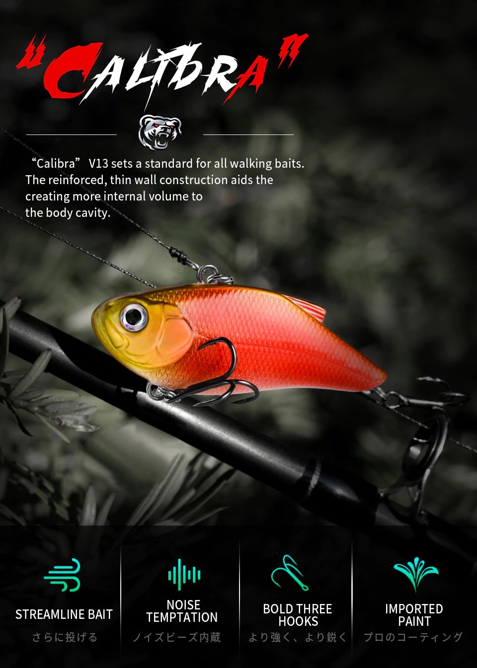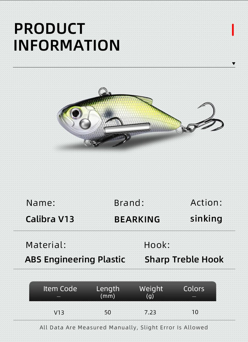 BearKing Calibra Fine 50 (реплика на Zipbaits Calibra Fine 50) имеет длину 50 мм, вес 7 грамм. Тип плавучести - тонущий (sinking). Тип воблера - vib (раттлин).
