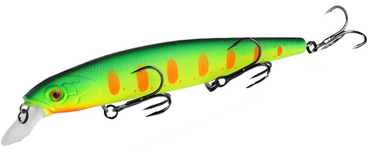 Длина приманки - 128 мм, вес 23 гр. Рабочая глубина от 1,2 до 1,5 метров. Плавучесть заявлена производителем как суспендер. Способ анимации — мягкий твичинг с паузами в 2-3 секунды, на которых чаще всего и происходят поклевки щуки. Благодаря системе дальнего заброса и своему немаленькому весу приманка летит далеко и точно даже против ветра. Отличная покраска, острые крючки, крепкие и надежные заводные кольца, невысокая цена — все это про BearKing Mag Squad 128 SP.