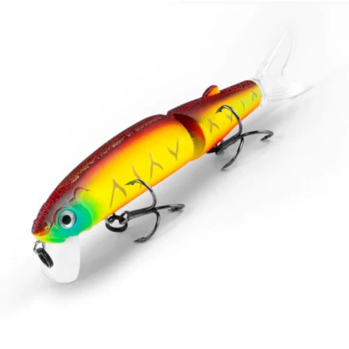 Приманка состоит из двух частей, каждая из которых подвижна. Так же в комплект входят два силиконовых хвостика. Тип копии – минноу. Длина приманки - 113 мм. Вес - 13 грамм. Заглубление 0,1-0,5 м. Размер приманки супер универсальный, отлично подойдет как для щуки, так и для другой хищной рыбы. Копия проста в использовании, не требовательна к строю спиннинга и навыкам рыболова. Идеально работает в окнах кувшинки и над травой на мелководье. Работает полный сезон открытой воды.