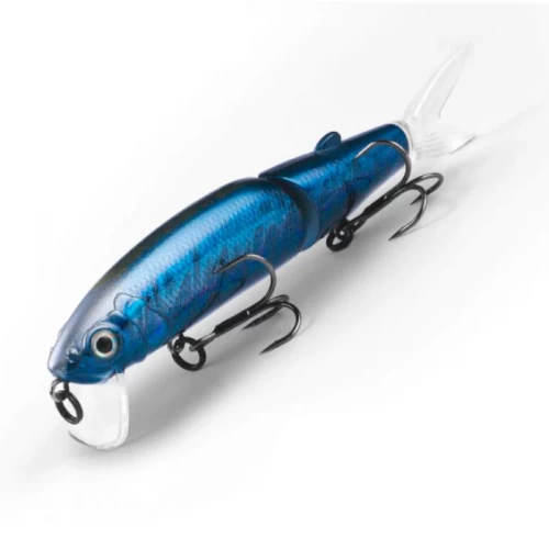 Приманка состоит из двух частей, каждая из которых подвижна. Так же в комплект входят два силиконовых хвостика. Тип копии – минноу. Длина приманки - 113 мм. Вес - 13 грамм. Заглубление 0,1-0,5 м. Размер приманки супер универсальный, отлично подойдет как для щуки, так и для другой хищной рыбы. Копия проста в использовании, не требовательна к строю спиннинга и навыкам рыболова. Идеально работает в окнах кувшинки и над травой на мелководье. Работает полный сезон открытой воды.