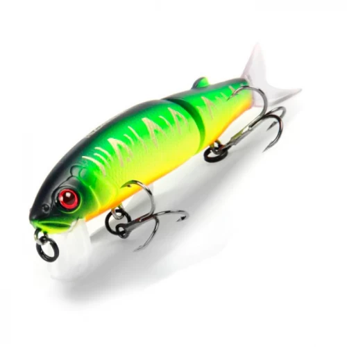Приманка состоит из двух частей, каждая из которых подвижна. Так же в комплект входят два силиконовых хвостика. Тип копии – минноу. Длина приманки - 113 мм. Вес - 13 грамм. Заглубление 0,1-0,5 м. Размер приманки супер универсальный, отлично подойдет как для щуки, так и для другой хищной рыбы. Копия проста в использовании, не требовательна к строю спиннинга и навыкам рыболова. Идеально работает в окнах кувшинки и над травой на мелководье. Работает полный сезон открытой воды.