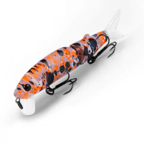 Приманка состоит из двух частей, каждая из которых подвижна. Так же в комплект входят два силиконовых хвостика. Тип копии – минноу. Длина приманки - 113 мм. Вес - 13 грамм. Заглубление 0,1-0,5 м. Размер приманки супер универсальный, отлично подойдет как для щуки, так и для другой хищной рыбы. Копия проста в использовании, не требовательна к строю спиннинга и навыкам рыболова. Идеально работает в окнах кувшинки и над травой на мелководье. Работает полный сезон открытой воды.