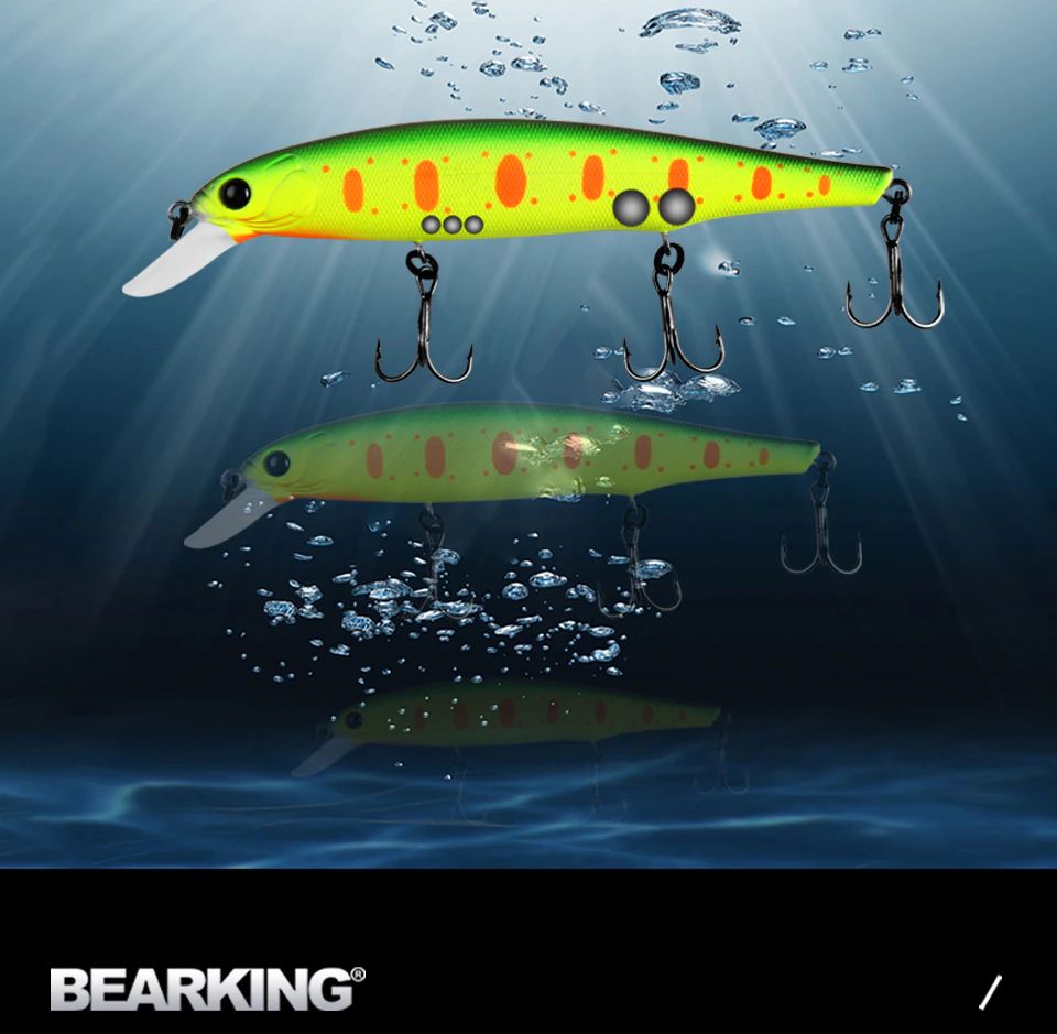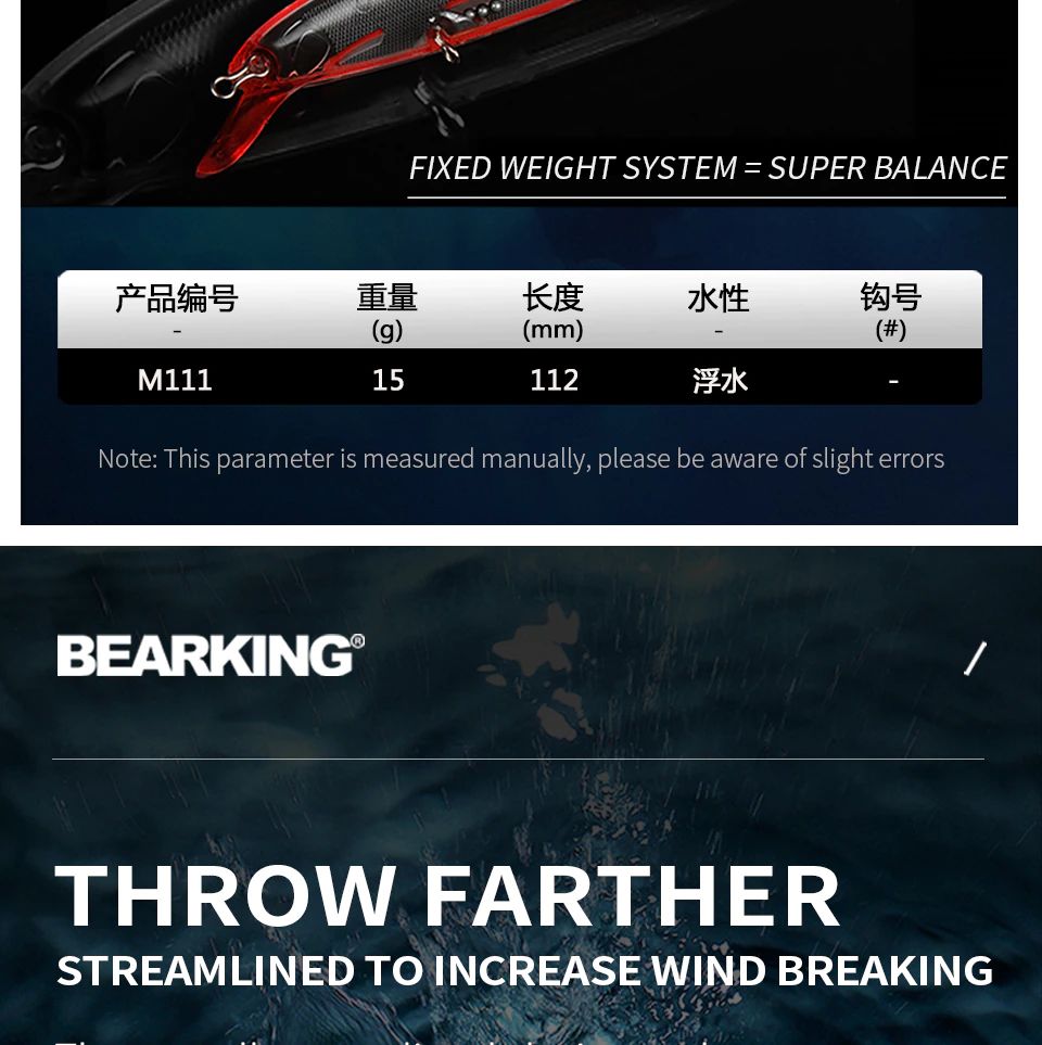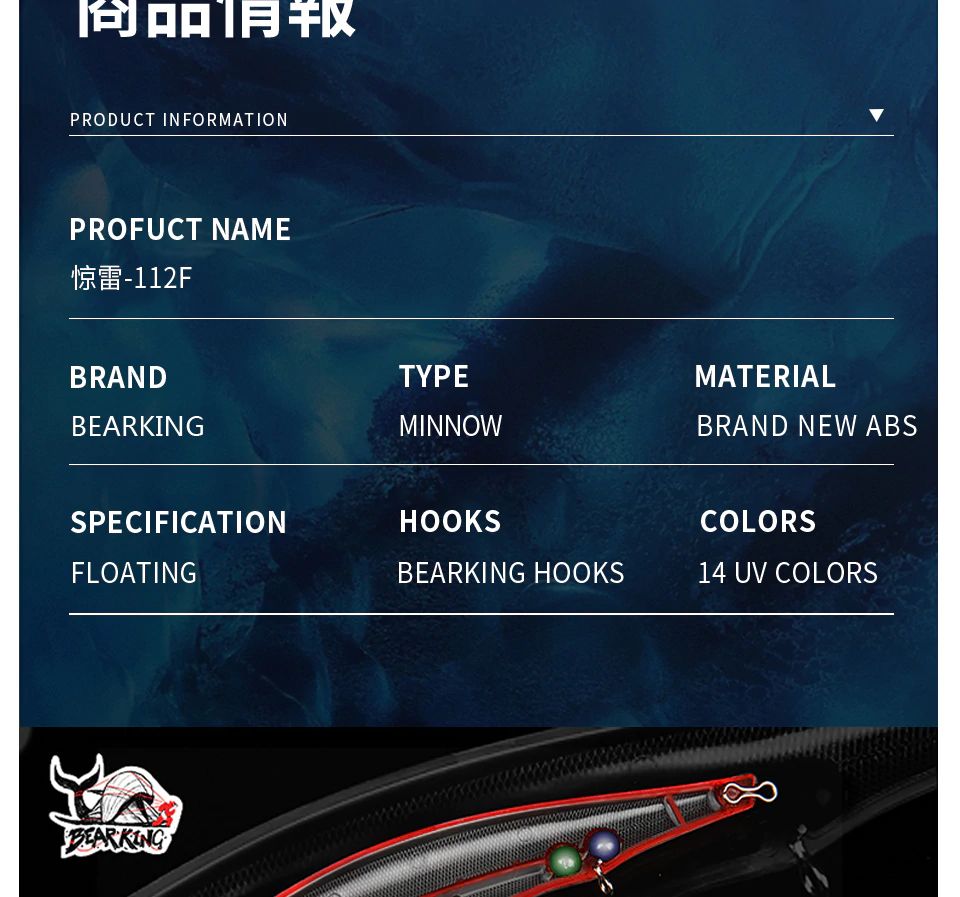 BearKing Riprizer 112F (реплика на Imakatsu Riprizer 112F) имеет длину 112 мм, вес 15 грамм, заглубление от 0,8 до 1,5 метра. Тип плавучести - плавающий (floating). Тип воблера - минноу(minnow).