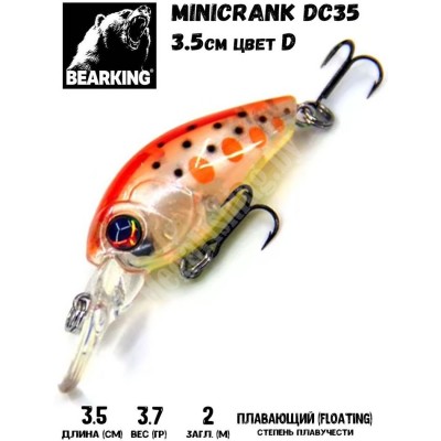 Bearking Minicrank DC35 – миниатюрный плавающий воблер класса кренк, разработанный для ловли твичингом и джерковой проводкой. Идеально подходит для охоты на осторожного хищника в прибрежной зоне.