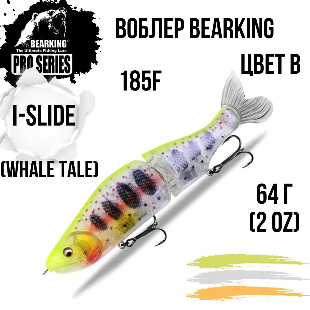 Bearking I-Slide 185F имеет длину 185 мм, вес 64 грамма, заглубление от 0 до 0.5 метра. Тип плавучести - плавающий (floating). Тип воблера - свимбейт (swimbait).
