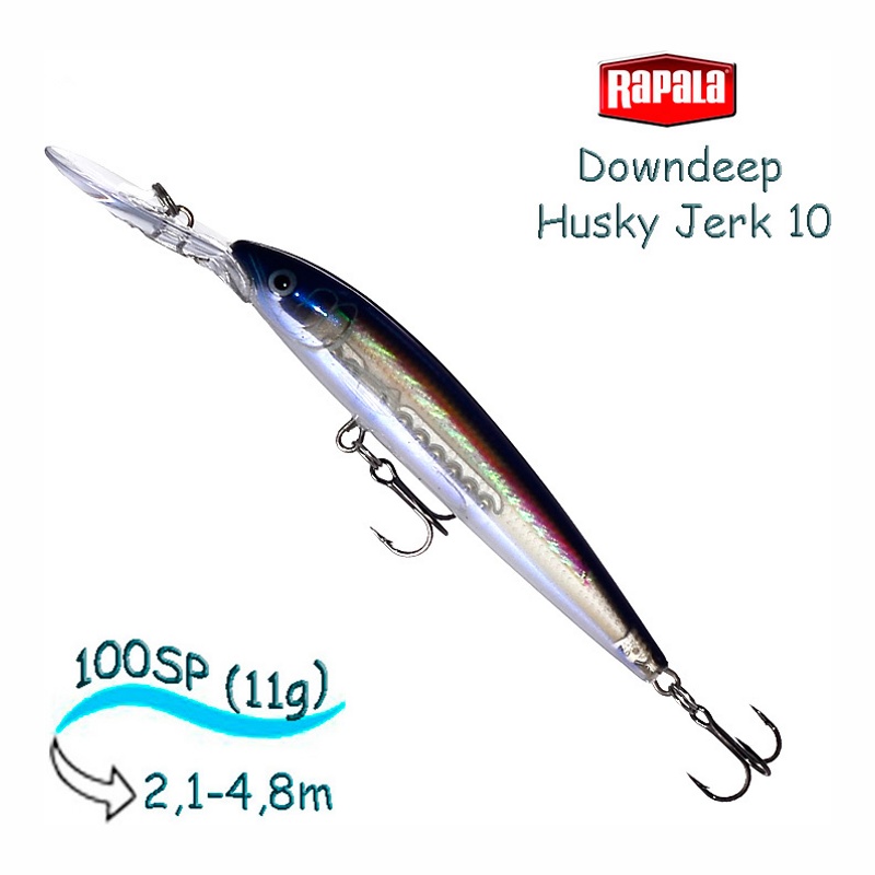 Воблер Down Deep Husky Jerk имеет нейтральную плавучесть, глубоко погружается и эффективен при ловле щуки, сома и судка. Эта приманка с великолепной возможностью заглубления одинаково годится для ловли спиннингом и для троллинга. Обладая свойствами суспендинга, Husky Jerk при остановке проводки не тонет и не поднимается к поверхности. Его игра отличается исключительной динамикой, и обладает непреодолимыми искушениями для таких хищников, как судаки щука. Ловя этой приманкой нашим основным козырем всегда будет заманивающий эффект в виде громкого, ритмичного шума, создаваемого звуковыми камерами. Длинная хвостовая часть воблера обеспечивает глубокое погружение, а тело с натуралистичной или кислотной окраской на удивление напоминает настоящую рыбку. Эффективная техника ловли заключается в следующем, сразу после заброса динамичными движениями необходимо смотать леску и опустить воблер на нужную глубину, если вы ловите спиннингом, то эффективной будет глубина 2-2.5 метра. Затем сделать небольшую паузу 2-3 секунды, резкий рывок не более 1 метра. Затем опять короткая пауза и опять резкая подмотка лески. Повторять эти действия каждый заброс, контролируя то, чтобы леска была натянута в момент поклевки. Рыба будет чаще всего клевать в момент подмотки лески или тогда, когда резко начинаете движение приманки.