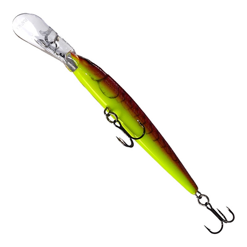 Воблер Down Deep Husky Jerk имеет нейтральную плавучесть, глубоко погружается и эффективен при ловле щуки, сома и судка. Эта приманка с великолепной возможностью заглубления одинаково годится для ловли спиннингом и для троллинга. Обладая свойствами суспендинга, Husky Jerk при остановке проводки не тонет и не поднимается к поверхности. Его игра отличается исключительной динамикой, и обладает непреодолимыми искушениями для таких хищников, как судаки щука. Ловя этой приманкой нашим основным козырем всегда будет заманивающий эффект в виде громкого, ритмичного шума, создаваемого звуковыми камерами. Длинная хвостовая часть воблера обеспечивает глубокое погружение, а тело с натуралистичной или кислотной окраской на удивление напоминает настоящую рыбку. Эффективная техника ловли заключается в следующем, сразу после заброса динамичными движениями необходимо смотать леску и опустить воблер на нужную глубину, если вы ловите спиннингом, то эффективной будет глубина 2-2.5 метра. Затем сделать небольшую паузу 2-3 секунды, резкий рывок не более 1 метра. Затем опять короткая пауза и опять резкая подмотка лески. Повторять эти действия каждый заброс, контролируя то, чтобы леска была натянута в момент поклевки. Рыба будет чаще всего клевать в момент подмотки лески или тогда, когда резко начинаете движение приманки.