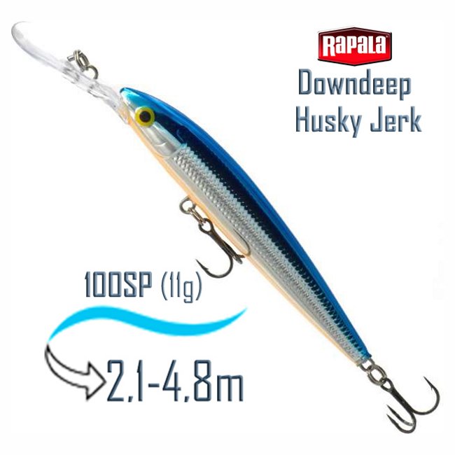 Воблер Down Deep Husky Jerk имеет нейтральную плавучесть, глубоко погружается и эффективен при ловле щуки, сома и судка. Эта приманка с великолепной возможностью заглубления одинаково годится для ловли спиннингом и для троллинга. Обладая свойствами суспендинга, Husky Jerk при остановке проводки не тонет и не поднимается к поверхности. Его игра отличается исключительной динамикой, и обладает непреодолимыми искушениями для таких хищников, как судаки щука. Ловя этой приманкой нашим основным козырем всегда будет заманивающий эффект в виде громкого, ритмичного шума, создаваемого звуковыми камерами. Длинная хвостовая часть воблера обеспечивает глубокое погружение, а тело с натуралистичной или кислотной окраской на удивление напоминает настоящую рыбку. Эффективная техника ловли заключается в следующем, сразу после заброса динамичными движениями необходимо смотать леску и опустить воблер на нужную глубину, если вы ловите спиннингом, то эффективной будет глубина 2-2.5 метра. Затем сделать небольшую паузу 2-3 секунды, резкий рывок не более 1 метра. Затем опять короткая пауза и опять резкая подмотка лески. Повторять эти действия каждый заброс, контролируя то, чтобы леска была натянута в момент поклевки. Рыба будет чаще всего клевать в момент подмотки лески или тогда, когда резко начинаете движение приманки.