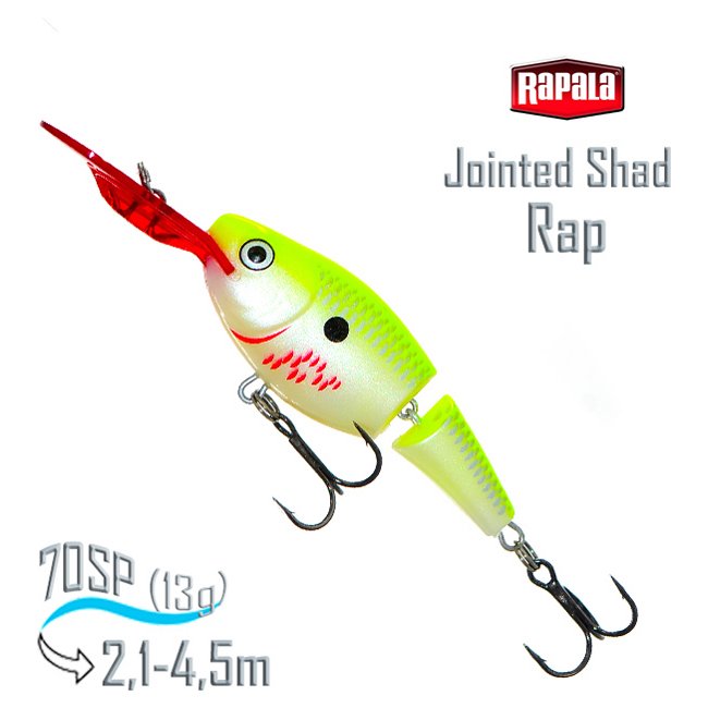 Составной воблер-шед Jointed Shad Rap от финского бренда Rapala отличается от знаменитого прототипа более мягкой и естественной игрой. Даже при медленной скорости проводки воблер соблазнительно играет, двигаясь по широкой амплитуде и напоминая маленькую рыбешку, перед которой не устоит ни один хищник. Дополнительной привлекательности приманке придает шумовая камера с металлическими шариками, расположенная в головном сегменте. Во время проводки шарики издают слышимое низкочастотное звучание, что служит дополнительной стимуляцией для хищника. Шарнирное соединение корпуса добавляет воблеру больше гибкости и плавности в движениях.