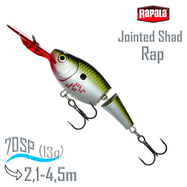 Составной воблер-шед Jointed Shad Rap от финского бренда Rapala отличается от знаменитого прототипа более мягкой и естественной игрой. Даже при медленной скорости проводки воблер соблазнительно играет, двигаясь по широкой амплитуде и напоминая маленькую рыбешку, перед которой не устоит ни один хищник. Дополнительной привлекательности приманке придает шумовая камера с металлическими шариками, расположенная в головном сегменте. Во время проводки шарики издают слышимое низкочастотное звучание, что служит дополнительной стимуляцией для хищника. Шарнирное соединение корпуса добавляет воблеру больше гибкости и плавности в движениях.