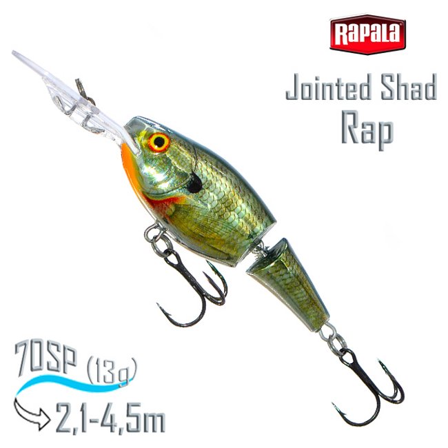 Составной воблер-шед Jointed Shad Rap от финского бренда Rapala отличается от знаменитого прототипа более мягкой и естественной игрой. Даже при медленной скорости проводки воблер соблазнительно играет, двигаясь по широкой амплитуде и напоминая маленькую рыбешку, перед которой не устоит ни один хищник. Дополнительной привлекательности приманке придает шумовая камера с металлическими шариками, расположенная в головном сегменте. Во время проводки шарики издают слышимое низкочастотное звучание, что служит дополнительной стимуляцией для хищника. Шарнирное соединение корпуса добавляет воблеру больше гибкости и плавности в движениях.
