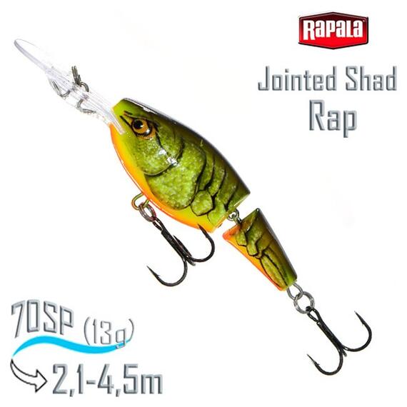 Составной воблер-шед Jointed Shad Rap от финского бренда Rapala отличается от знаменитого прототипа более мягкой и естественной игрой. Даже при медленной скорости проводки воблер соблазнительно играет, двигаясь по широкой амплитуде и напоминая маленькую рыбешку, перед которой не устоит ни один хищник. Дополнительной привлекательности приманке придает шумовая камера с металлическими шариками, расположенная в головном сегменте. Во время проводки шарики издают слышимое низкочастотное звучание, что служит дополнительной стимуляцией для хищника. Шарнирное соединение корпуса добавляет воблеру больше гибкости и плавности в движениях.
