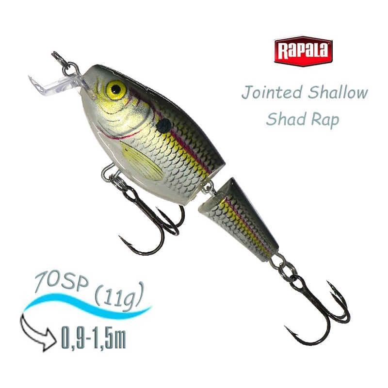 Воблер Rapala Jointed Shallow Shad Rap – это мелководная серия, уже ставшего популярным, составника Jointed Shad Rap, который активно применяется нашими спиннингистами. Мелководная модель составного воблера теперь дополняет классическую и позволяет облавливать различные мелкие участки, будь-то жабовники и болотистые водоемы или обширные разливы водохранилищ и старицы крупных рек. Этот воблерок предназначен, прежде всего, для ловли щуки и окуня, но также может словить жереха или ночного судака. Хвостовая часть приманки присоединяется к телу за счет прочного металлического каркаса. Данное соединение обеспечивает достаточную свободу хвостовой части, благодаря чему приманка весьма подвижна, даже, на сверхмедленных проводках. Лопатка приманки имеет небольшие размеры и загнутую форму, которая и определяет ее горизонт ловли. Воблер Rapala Jointed Shallow Shad Rap работает на глубинах под полтора метра и дает возможность обловить практически любое мелководье на любом водоеме.