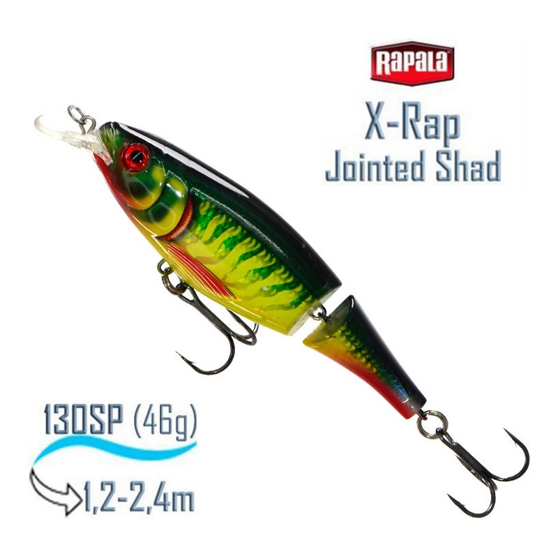 Длина этого объемного составника составляет 13 см при весе в целых 46 граммов. Составной воблер Rapala X-Rap Jointed Shad весьма увесистый и, несмотря на парусность, достаточно далеко летит на броске. Конечно, данный воблер следует применять только с кастинговыми снастями, поскольку более привычная нашему спиннингисту безынерционная катушка придет в негодность после нескольких рыбалок с такой упористой и тяжелой объемной спиннинговой приманкой.