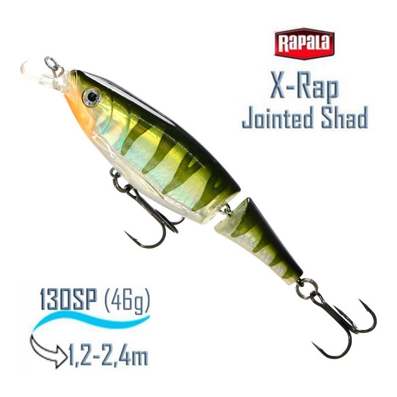 Длина этого объемного составника составляет 13 см при весе в целых 46 граммов. Составной воблер Rapala X-Rap Jointed Shad весьма увесистый и, несмотря на парусность, достаточно далеко летит на броске. Конечно, данный воблер следует применять только с кастинговыми снастями, поскольку более привычная нашему спиннингисту безынерционная катушка придет в негодность после нескольких рыбалок с такой упористой и тяжелой объемной спиннинговой приманкой.