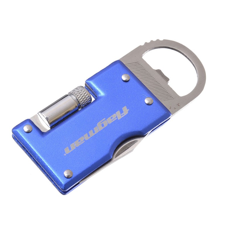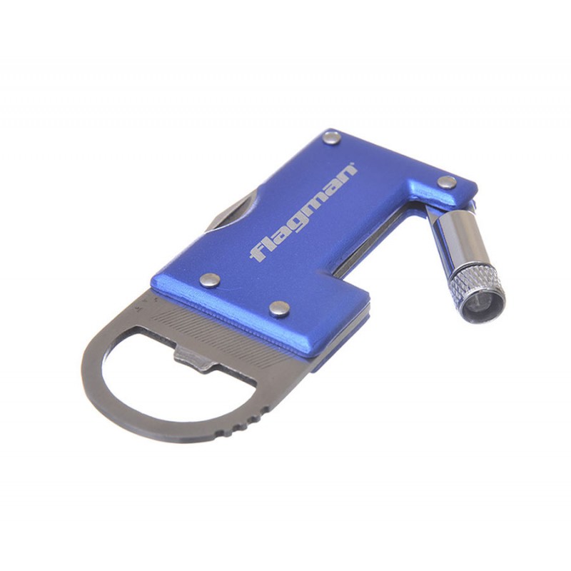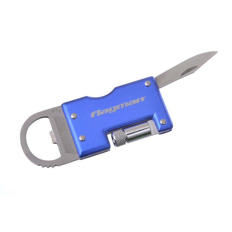 Удобный и функциональный брелок, включающий складной ножик, складной светодиодный фонарик, пилку для ногтей и открывалку для бутылок. Поставляется в прочном тканевом чехле.