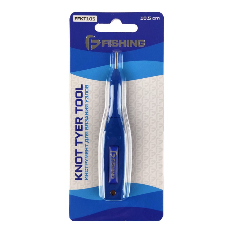 F-FISHING Knot Tyer 10,5 см — компактный и удобный инструмент для быстрой вязки узлов и петель. Он идеально подходит для соединения флюорокарбона с леской (шнуром). В рукоятке встроен LED-фонарик и миниатюрный магнит, на который можно повесить застежку, пока вяжется поводок. Фонарик достаточно яркий, чтобы осветить рыболовную сумку или коробку с аксессуарами в темное время суток. На обратной стороне блистерной упаковки есть мини-инструкция по вязке узлов в виде серии рисунков.