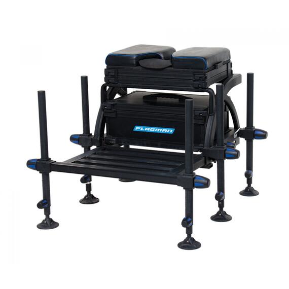 Очень мощная, исключительно устойчивая платформа для спортсменов и продвинутых любителей. Собрана на профилированной сварной алюминиевой раме. Удобное сиденье снабжено держателем комля. Прочная алюминиевая педана имеет выдвижную конструкцию. Непосредственно под сидением находится выдвижной ящик и модуль для мотовил, который, благодаря особой конструкции шарниров-замков, может открываться как вперед, так и назад. Кроме того, платформа укомплектована съемным модулем большого объема, в котором могут храниться катушки и прочие крупные предметы. Платформа поставляется с шестью ногами. Все они имеют телескопическую конструкцию и снабжены шарнирно закрепленными пятками, которые не дают им проваливаться в грунт. Для переноски платформы служит мощный съемный плечевой ремень с четырьмя точками крепления.