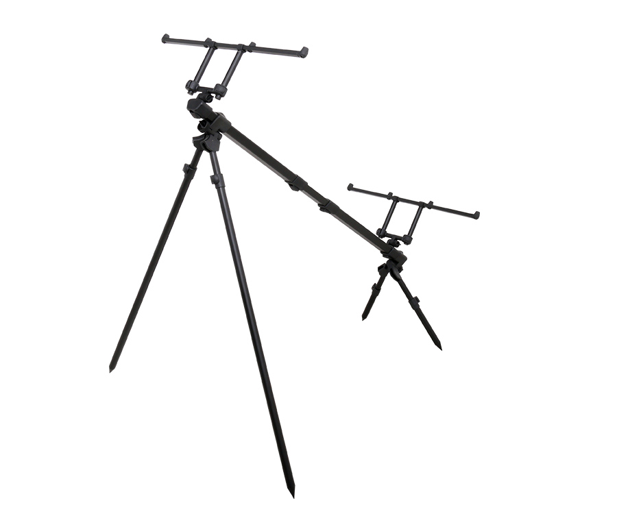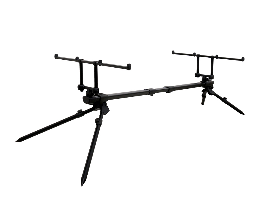 Легкий и очень устойчивый род-под. Он исключительно компактен в транспортировочном положении. Благодаря телескопической конструкции может быть настроен для удилищ разной длины и с разным расположением пропускных колец. Ноги имеют телескопическую конструкцию и регулируемый наклон, фиксаторы отличаются удобством и надежностью. Кроме того, в широких пределах регулируется высота буз-баров. Род-под представлен в черной окраске. Поставляется в чехле из прочной ткани.