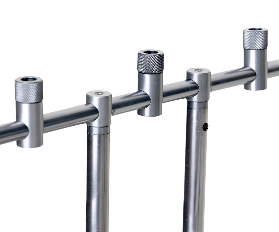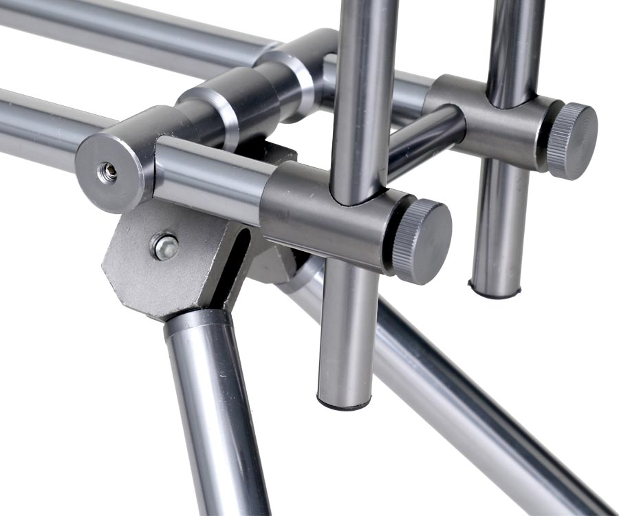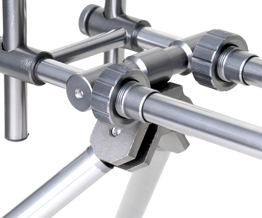 Этот род-под – прекрасное сочетание функциональности и великолепного дизайна. Все детали, включая винты, шарниры и соединения, выполнены из алюминия с покрытием серого цвета. Пластик в конструкции отсутствует, что увеличивает долговечность род-пода. Он компактен в сложенном виде, очень быстро приводится в рабочее положение. Благодаря возможности установки ног под разными углами расширяется возможность регулировки наклона всего род-пода, этому способствует и разная длина двух пар ног. Их длина в выдвинутом положении фиксируется поворотом нижнего колена, благодаря чему эта операция занимает считанные секунды. Заостренные наконечники способствуют надежной фиксации ног на различных поверхностях. Длина станины род-пода также регулируется. Фиксируется она двумя цанговыми зажимами с помощью гаек, которые легко затягиваются от руки. Можно снять одну из головок, переоборудовав род-под для крепления трех удилищ, вместо четырех. Головки снабжены контргайками для более надежного крепления сигнализаторов и держателей удилищ. Поставляется в прочном защитном чехле, облегчающем транспортировку и хранение.