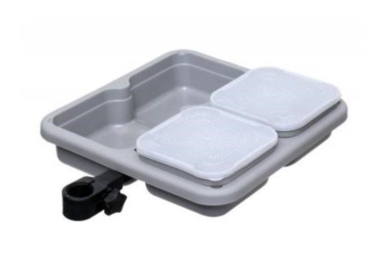 Прямоугольная пластиковая подставка-емкость 48х37 см с двумя вынимающимися коробками. Коробки 17х17х9 см оснащены крышками с отверстиями. Подставка-емкость предназначена для хранения небольшой порции прикормки, насадок и живых компонентов, используемых в процессе ловли. Оборудована универсальным креплением под ногу платформы с диаметром 25, 30 и 36 мм.