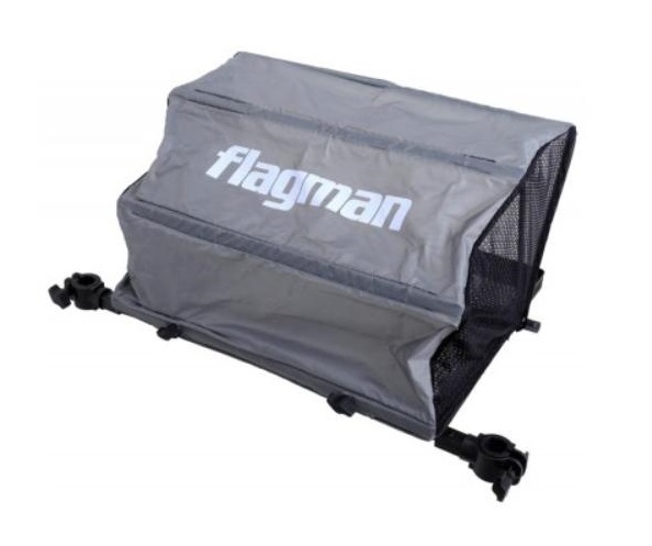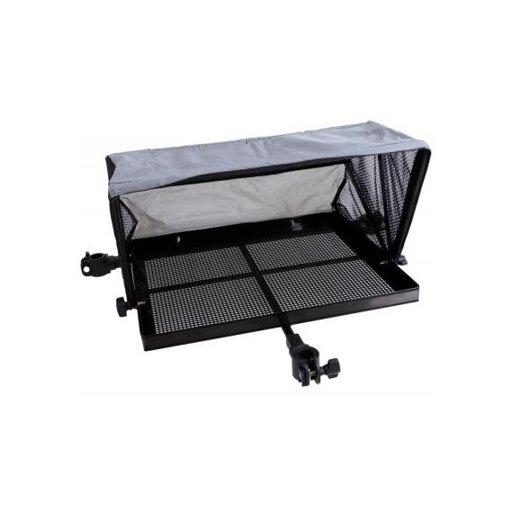 Небольшой боковой столик для платформы. Крепится к ноге. Оборудован складным тентом для защиты наживки и прикормки от солнца и дождя. Перфорированная конструкция обеспечивает хорошую вентиляцию при закрытом тенте и не дает воде скапливаться на столике. Выполнен из прочного алюминиевого сплава. Предназначен для платформ с диаметром ног 36 мм и оборудован быстросъемным креплением.