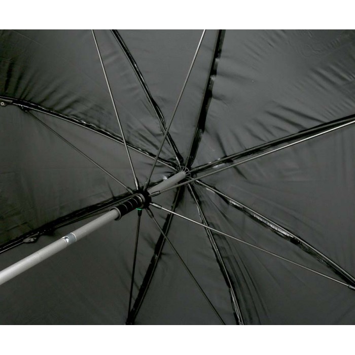 Качественный и надежный рыболовный зонт, защищающий от солнца и дождя. Спицы сделаны из фибрегласса (стеклопластика), тент — из легкого и прочного нейлона. Причем особая геометрия тента позволяет устойчиво располагать зонт на земле. Металлические элементы каркаса способны выдерживать значительные нагрузки, возникающие при порывах ветра. Предусмотрена возможность наклона зонта за счет механического шарнира. Зонт можно установить на платформу или кресло. Для транспортировки зонта в сложенном состоянии используется чехол с плечевым ремнем.