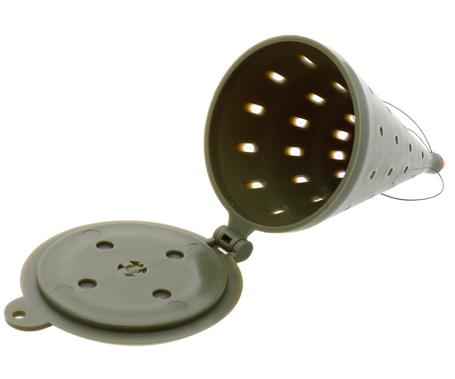 Кормушка для зимней рыбалки из прочного пластика. Откидывающееся дно огружено и крепится к кормушке шарнирным соединением, что делает конструкцию прочной и надежной. В отличие от громких металлических конструкций, эта кормушка открывается бесшумно.