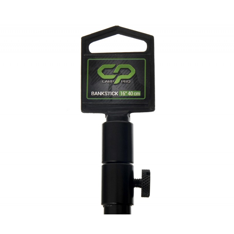 Carp Pro Bankstick – телескопическая стойка из алюминия, которая отличается высокой прочностью и стильным черным дизайном. Для фиксации выбранной высоты стойки ее верхняя часть (внутренняя трубка) крепится к нижней части надежным винтом с накаткой и шлицом, который закручивается от руки или отверткой. Нижняя часть оборудована острием, легко проникающим в грунт. Резьба позволяет установить на стойку Carp Pro Bankstick буз-бар, сигнализатор поклевки, держатель комля и т.п. Банкстик телескопический Carp Pro Bankstick 16" имеет длину 40-70 см.