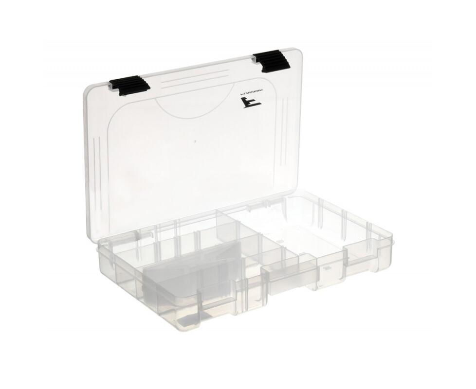 Flagman Tackle Box #3 – прозрачная рыболовная коробка, изготовленная из полипропилена. Устойчива к воздействию материала мягких пластиковых приманок. Коробка Tackle Box #3 оснащена пятью широкими отсеками для хранения приманок. Кроме того, каждый отсек делится на несколько ячеек с помощью съемных перегородок. Такой поход позволяет произвольно выбирать размер и количество ячеек, формируя внутреннее пространство коробки под конкретные задачи. Крышка крепиться с помощью шарнирного соединения и закрывается на два замка-защелки. Размеры Tackle Box #3: 275х165х45 мм.