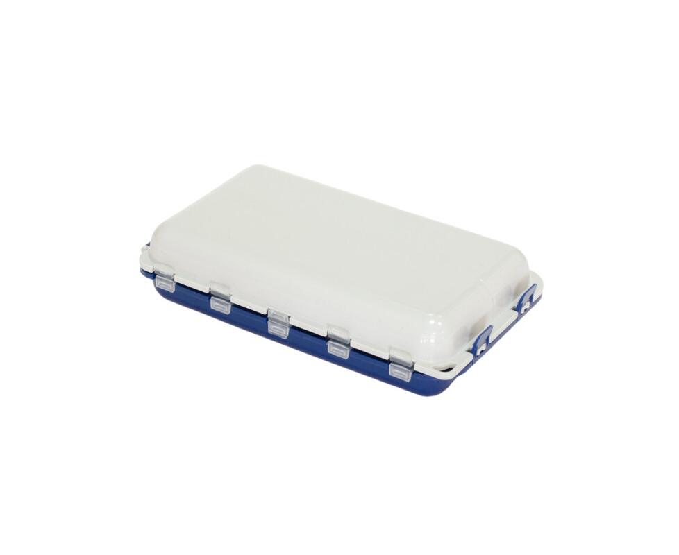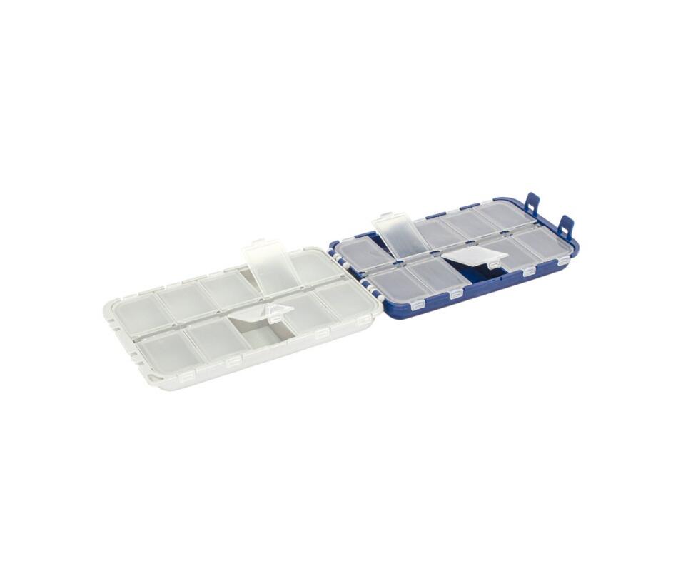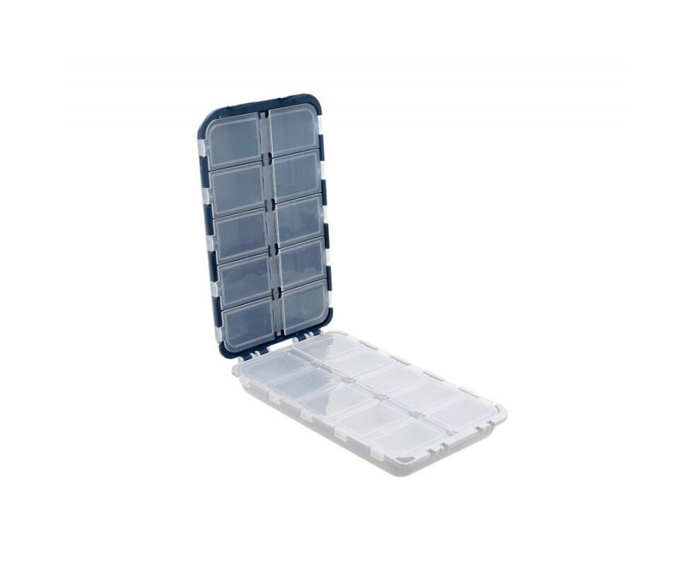 Коробка из полипропилена. Устойчива к воздействию масел, растворителей и силикона, предназначена для вертлюжков, мормышек, мелких блесен, миниатюрных джиговых приманок и т.д. Имеет две поверхности, которые оборудованы двадцатью маленькими отсеками с прозрачными крышками. Оснащена ушком для крепления и закрывается на защёлки.