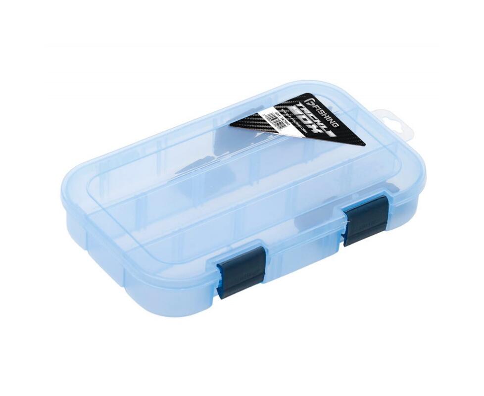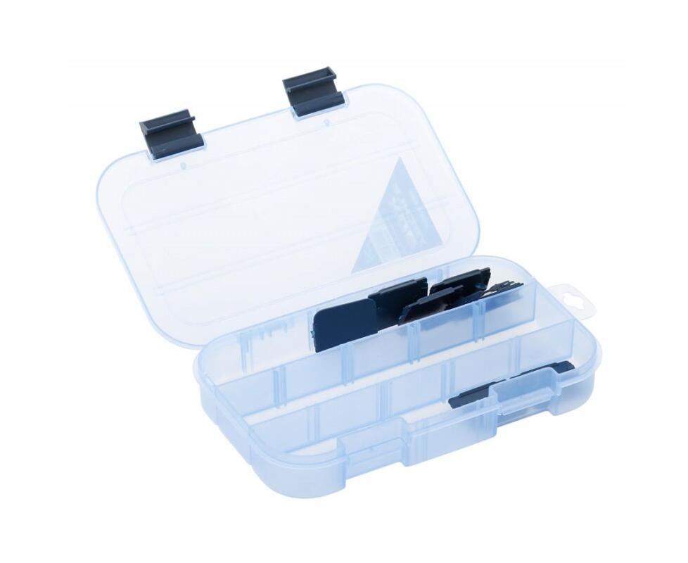 Коробка из полипропилена. Устойчива к воздействию масел, растворителей и силиконов. Оснащена тремя широкими отсеками для хранения приманок. Кроме того, каждый отсек делится ещё на несколько с помощью 10 съёмных перегородок. Крышка крепиться с помощью шарнирного соединения и закрывается на замок-защелку.