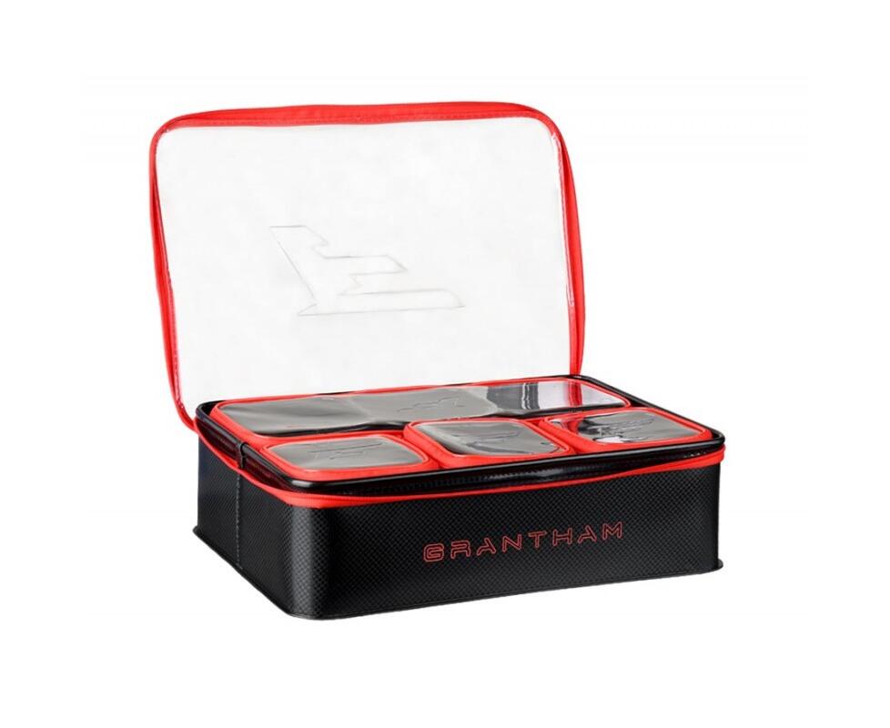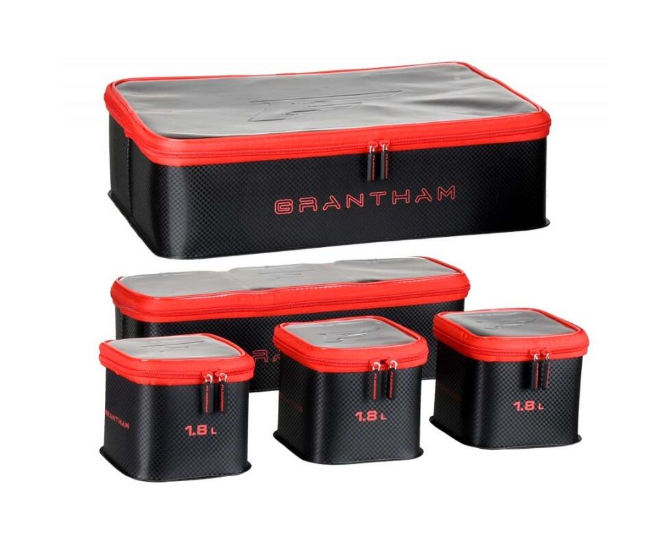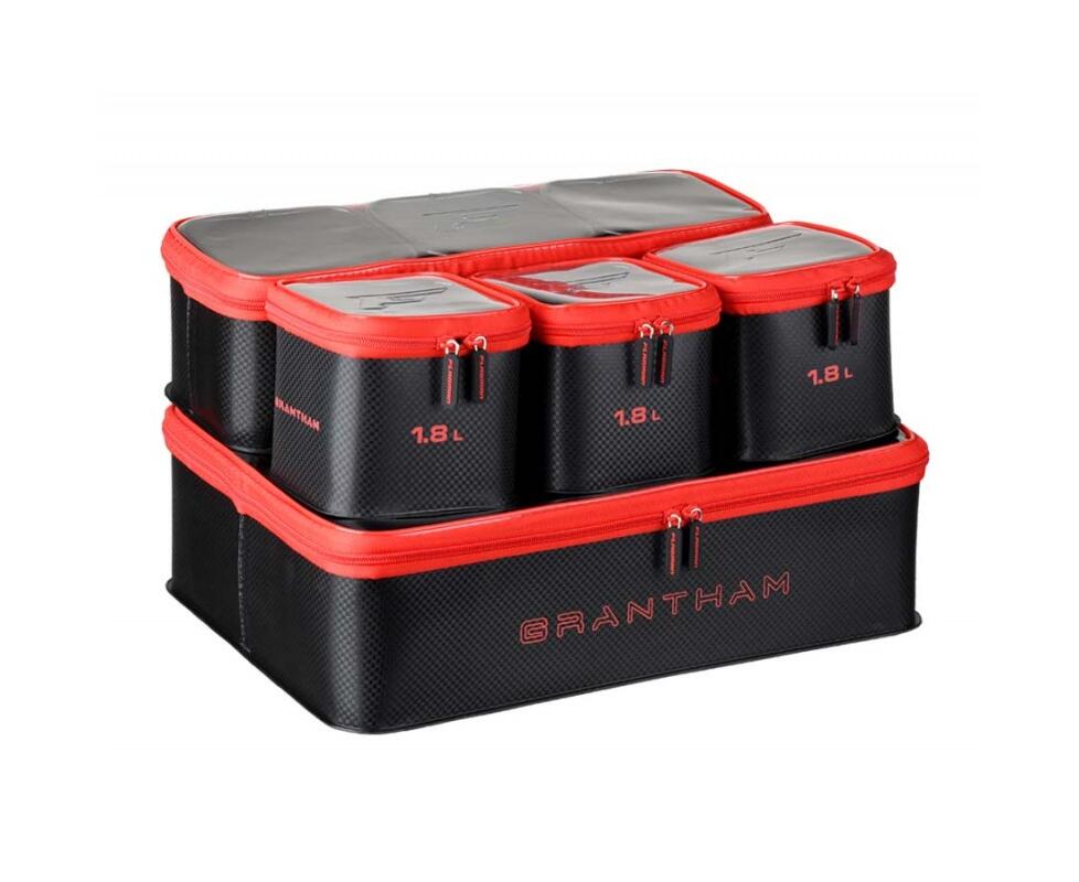 Flagman Grantham Woven Eva Set 7+1 – набор емкостей для хранения приманок. Состоит из основной емкости 15 л (45x33x13 см), в которой расположены четыре емкости меньшего размера: три небольших квадратных по 1,8 л (14x14x12 см) и одна большая прямоугольная 6 л (43x15x12 см), в которой размещаются еще три квадратных емкости по 1,8 л (14x14x12 см) без крышек. Основная емкость и четыре меньших имеют прозрачные крышки, что значительно облегчает идентификацию их содержимого. Все крышки закрываются на двусторонние молнии. Емкости изготовлены из EVA со специальным армирующим покрытием WOVEN EVA. Они легко очищаются от загрязнений, не пропускают воду, не накапливают запахи.