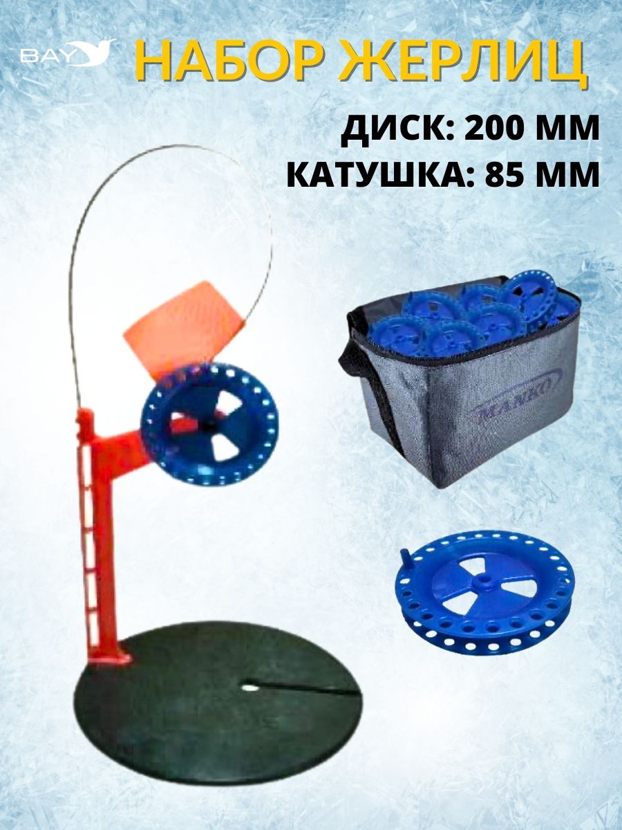 Жерлица зимняя со стопором на платформе и с флажком неоснащенная ПРО2– набор 10 штук в сумке. Жерлица для рыбалки изготовлена из высококачественного полипропилена и используется рыбаками для ловли хищных рыб. В данной конструкции основанием служит диск, изготовленный из морозоустойчивого пластика. На нем есть желобок, в который вставляется катушка на подставке и прорезь для лески. Достоинство такой конструкции — в удобстве сборки, возможности легко разобрать для удобной транспортировки, компактности и легкости. А благодаря широкой (200 мм в диаметре) тарелке, жерлица полностью закрывает лунку. Помимо этого, это ещё препятствует быстрому замерзанию лунки, а также попаданию в нее света, что может насторожить хищную рыбу. Диаметр катушки для рыбалки 85мм. Имеется стопор катушки рыболовной! Снасть рыболов оборудована удобным тормозом, который фиксирует леску в нужном положении и позволяет спокойно насадить живца и зафиксировать флажок, а потом снять тормоз и длина лески, отмеренная вами не изменится. Стопор позволяет перемещать жерлицы не разбирая, фиксирует катушку прочно, леска натянута и не путается, тот кто часто рыбачит на жерлицы оценит данный стопор. Ведь правильно подобранная оснастка жерлиц определяет половину успеха в ловле хищников: щук, окуня или судака. В наборе есть яркие флажки, которые и проклеены, и прошиты. Успешная ловля щуки на флажки вам обеспечена. Поводок рыболовный на щуку для ловли со льда продуман до мелочей. Набор для рыбалки станет превосходным подарком для любителя рыбалки. Все комплекты упаковываются и поставляются в картонной коробке, для того что бы дойти к вам в целостности и сохранности. Данные наборы прекрасно подойдут на подарок рыбаку: на новый год, день рождения, а также это замечательный подарок для любимых без повода