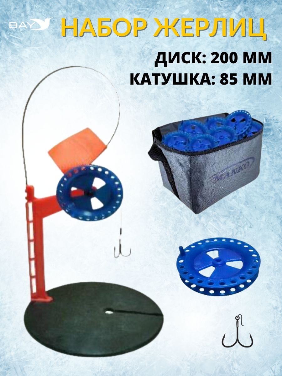 Жерлица зимняя со стопором на платформе и с флажком оснащенная ПРО2– набор 10 штук в сумке. Жерлица для рыбалки изготовлена из высококачественного полипропилена и используется рыбаками для ловли хищных рыб. В данной конструкции основанием служит диск, изготовленный из морозоустойчивого пластика. На нем есть желобок, в который вставляется катушка на подставке и прорезь для лески. Достоинство такой конструкции — в удобстве сборки, возможности легко разобрать для удобной транспортировки, компактности и легкости. А благодаря широкой (200 мм в диаметре) тарелке, жерлица полностью закрывает лунку. Помимо этого, это ещё препятствует быстрому замерзанию лунки, а также попаданию в нее света, что может насторожить хищную рыбу. Диаметр катушки для рыбалки 85мм. Имеется стопор катушки рыболовной! Снасть рыболов оборудована удобным тормозом, который фиксирует леску в нужном положении и позволяет спокойно насадить живца и зафиксировать флажок, а потом снять тормоз и длина лески, отмеренная вами не изменится. Стопор позволяет перемещать жерлицы не разбирая, фиксирует катушку прочно, леска натянута и не путается, тот кто часто рыбачит на жерлицы оценит данный стопор. Ведь правильно подобранная оснастка жерлиц определяет половину успеха в ловле хищников: щук, окуня или судака. В наборе есть яркие флажки, которые и проклеены, и прошиты. Успешная ловля щуки на флажки вам обеспечена. Поводок рыболовный на щуку для ловли со льда продуман до мелочей. Набор для рыбалки станет превосходным подарком для любителя рыбалки. Все комплекты упаковываются и поставляются в картонной коробке, для того что бы дойти к вам в целостности и сохранности. Данные наборы прекрасно подойдут на подарок рыбаку: на новый год, день рождения, а также это замечательный подарок для любимых без повода