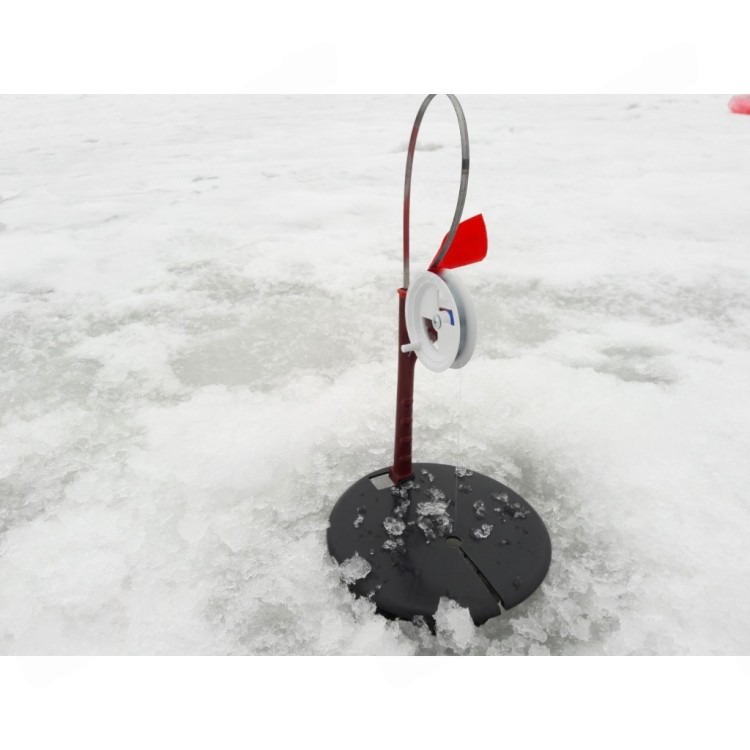Основа жерлицы — прочный круглый диск диаметром 190 мм, который полностью перекрывает лунку. Это защищает её от быстрого обмерзания, снижает попадание снега и света, а также делает снасть более устойчивой на льду. Вертикальная стойка обеспечивает правильное положение флажка и катушки, сохраняя стабильную работу механизма даже при сильных порывах ветра.