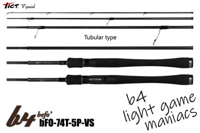 Tict R-Special Befo' bFO-74S-5P-VS – спиннинг, состоящий из пяти колен, который ориентирован для путешествий, для дальних выездов, вплоть для классического стритфишинга, если нет желания возиться с длинными удилищами и тубусами для их перевозки в общественном транспорте. Ведь, благодаря своей транспортировочной длине в 54 см, данная модель спиннингового удилища, без проблем поместится в рюкзак или рыболовный ящик.