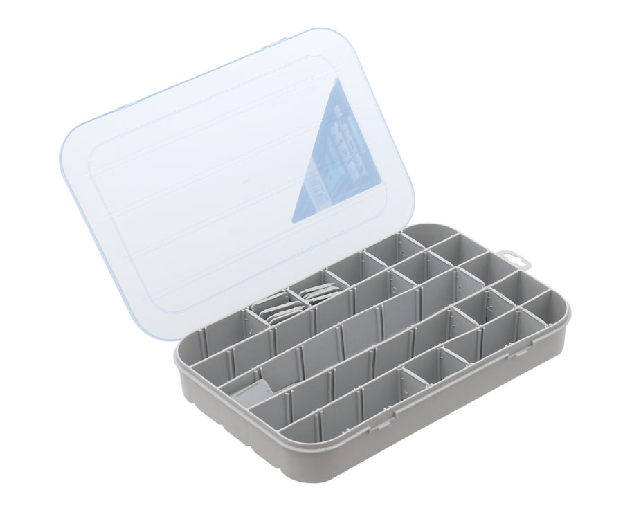Рыболовная коробка из полипропилена. Устойчива к воздействию масел, силиконов и растворителей. Предназначена для хранения, как достаточно крупных приманок и аксессуаров, так и вертлюжков, застежек и т.д. Имеет одну основную поверхность, на которую устанавливаются до 30 перегородок, с помощью которых рабочие пространство можно составить самостоятельно. Коробка имеет прозрачную крышку и закрывается на защёлки. Оснащена ушком для крепления.