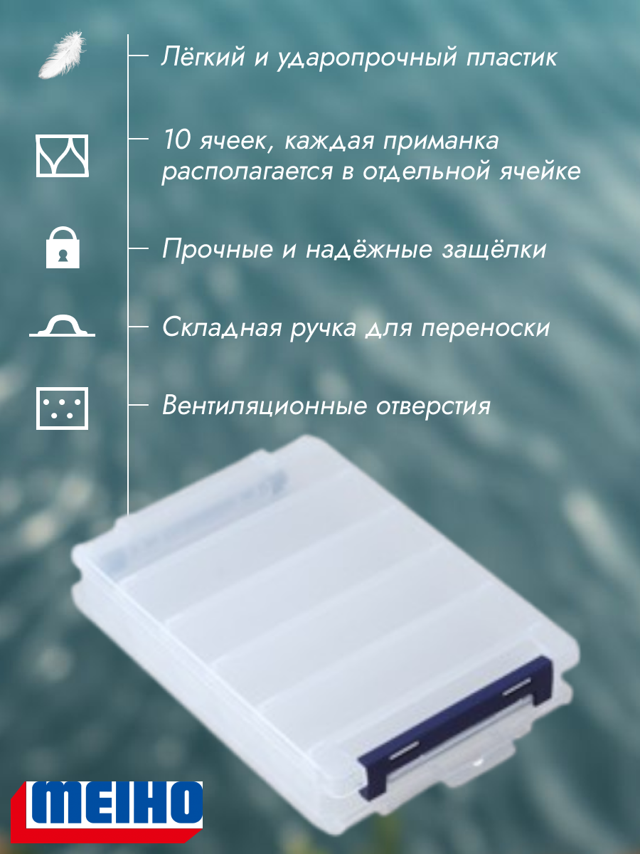 Данная модель отличается от аналогов линейки Meiho Reversible измененной конструкцией замкового механизма и петель, расположенных на коротких сторонах изделия. Такое решение позволило уменьшить ширину коробки, повысив ее эргономичность при размещении в ограниченном пространстве.