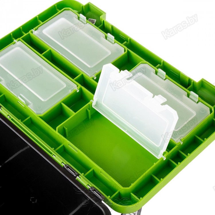 Пластик не подвержен деформациям и прекрасно удерживает первоначальную форму ящика даже при значительном весе рыбака. Ящик из такого пластика не впитывает запахи и легко отмоется от рыбной слизи, глины и других загрязнений. Функциональное основное отделение служит своеобразным каркасом, предотвращающим прогибы ящика и надежно удерживающим вес рыбака. Съемные перегородки предназначены для более удобного хранения принадлежностей.