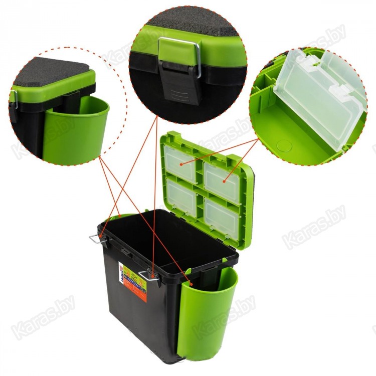 - Регулируемый по длине плечевой ремень с прорезиненной вставкой, которая предотвращает соскальзывание ящика с плеча во время движения. - Удобные защелки крышки. - Мягкое сидение из пенополиуретана на крышке, которое не впитывает влагу. - Специальные противоскользящие элементы на дне ящика.