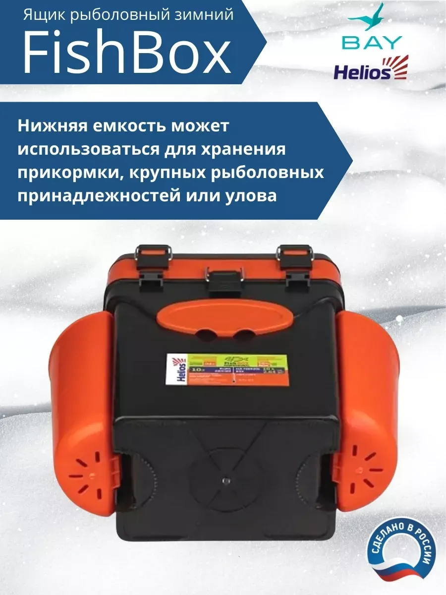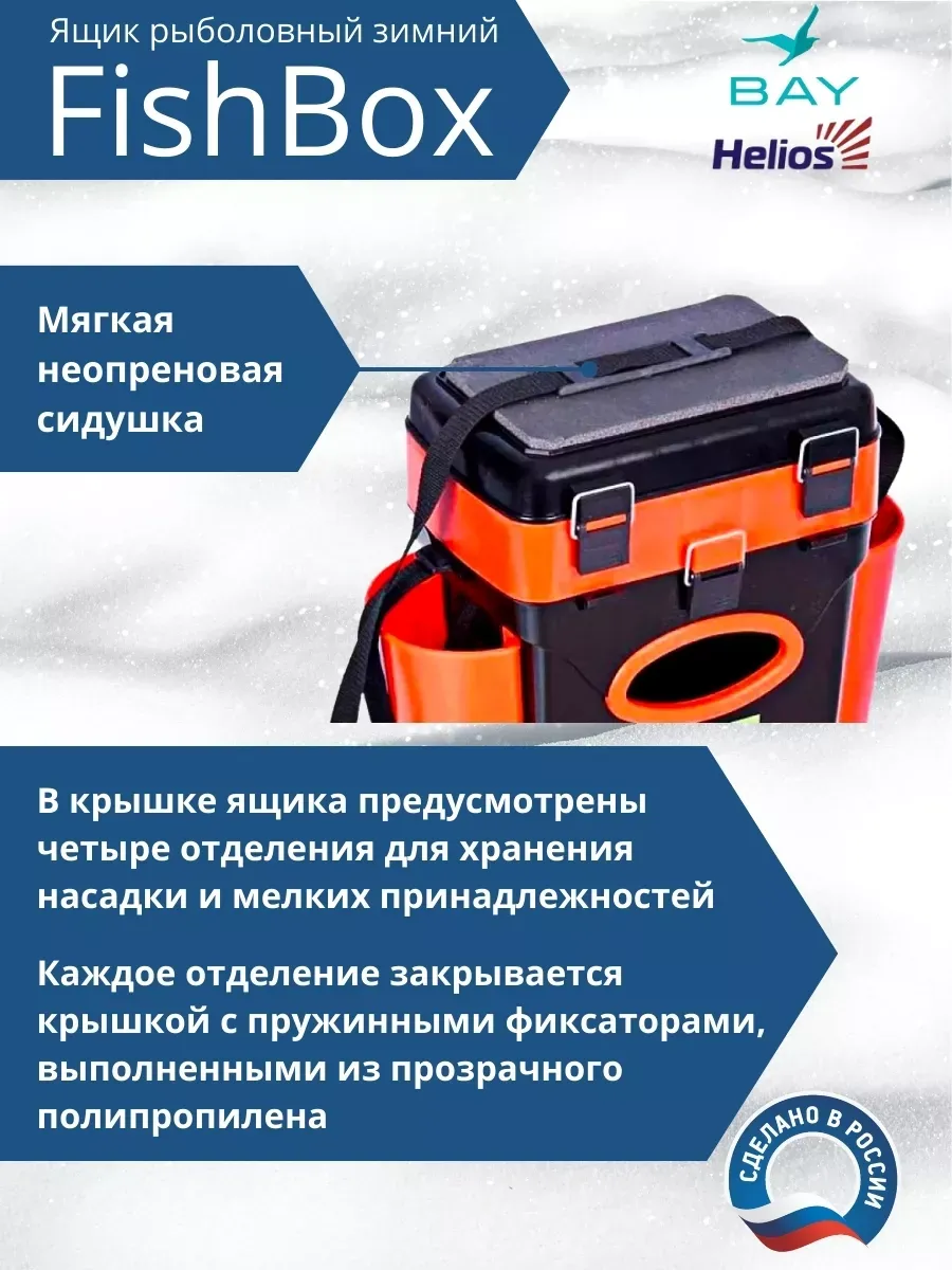 Наш рыболовный ящик FishBox - незаменимый аксессуар для всех любителей зимней рыбалки. Ящик пластиковый производится в России, на заводе Тонар, выдерживает вес до 210 кг (рекомендованный вес – 120 кг). Он обеспечивает сохранность вашего улова и позволяет удобно хранить все необходимые принадлежности во время рыбалки. Пластиковый ящик для хранения снастей FishBox вмещает от 10 литров груза и имеет удобный и прочный ремень с резиновой вставкой для переноски. Его компактные размеры позволяют легко поместить в любой автомобиль, сани, лодку. Ящик для рыбалки зимний выполнен из высококачественного материала, не боится низких температур, не подвержен деформациям, не впитывает запахи и легко отмоется от любых загрязнений. Ящик для рыболовных снастей FishBox от Helios отлично подходит и для летней рыбалки, в нем можно разместить все необходимые аксессуары и вещи, продукты. Помимо вместительного основного отделения, ящик для снастей имеет на крышке 3 бокса для мелких расходников и принадлежностей. Вы больше не будете складывать все в кучу, а сможете организовать все предметы в ящике и легко найти необходимое, ведь внутри основного отделения ящика, есть сменные перегородки, которые помогут разделить пространство. Мягкое и теплое сиденье остается комфортным даже в морозы. Система навесных пластиковых карманов позволяет удобно расположить все рыболовные инструменты. Их можно легко навесить и снять уже находясь на месте ловли. Комплектуются плечевым карманом.