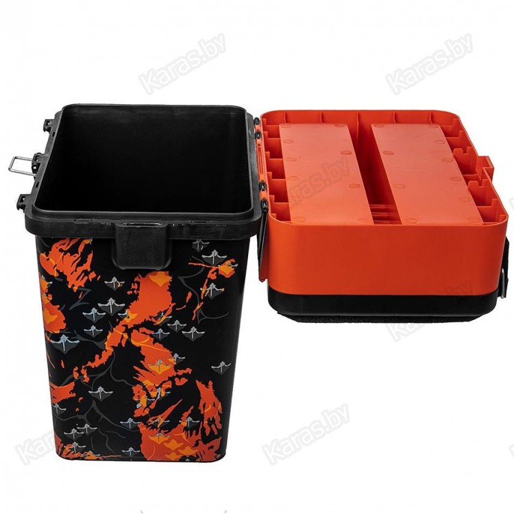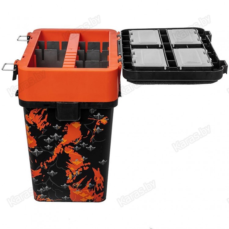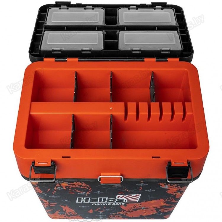 Ящик зимний рыболовный торговой марки Helios, изготовленный из ударопрочного, морозостойкого и в то же время легкого пластика, обеспечивает надежное хранение и транспортировку рыболовных снастей. Рыболовный ящик выгодно отличается среди аналогичных ярким и современным дизайном (уникальный паттерн разработан дизайнерами ГК ""ТОНАР""). Благодаря объему 19 литров, ящик вместит очень много полезных снастей для рыбалки. Дополнительная проставка с 2 отсеками и съемными перегородками позволяет разместить небольшие удочки и другие снасти. Основной отсек предназначен для переноски рыболовных снастей, термоса, так же удобен для перевозки улова. На внутренней стороне крышки размещены 4 отделения с полупрозразчными крышечками для хранения мелких аксессуаров. Удобные и надежные замки гарантируют плотное прилегание крышки к основному отсеку ящика. В комплекте идет регулируемый по длине плечевой ремень с прорезиненным наплечником, предотвращающим соскальзывание ящика с плеча во время движения. Пластиковый каркас выдерживает низкие температуры до -40°С, не пропускает и не впитывает воду. Мягкое незамерзающее сиденье на крышке ящика, аккумулирующее тепло, позволит рыболову комфортно рыбачить с ящика долгое время. На дне ящика расположены специальные насечки против скольжения по льду. Летом подобный ящик несомненно пригодится для береговой рыбалки, когда необходимо иметь все снасти под рукой.